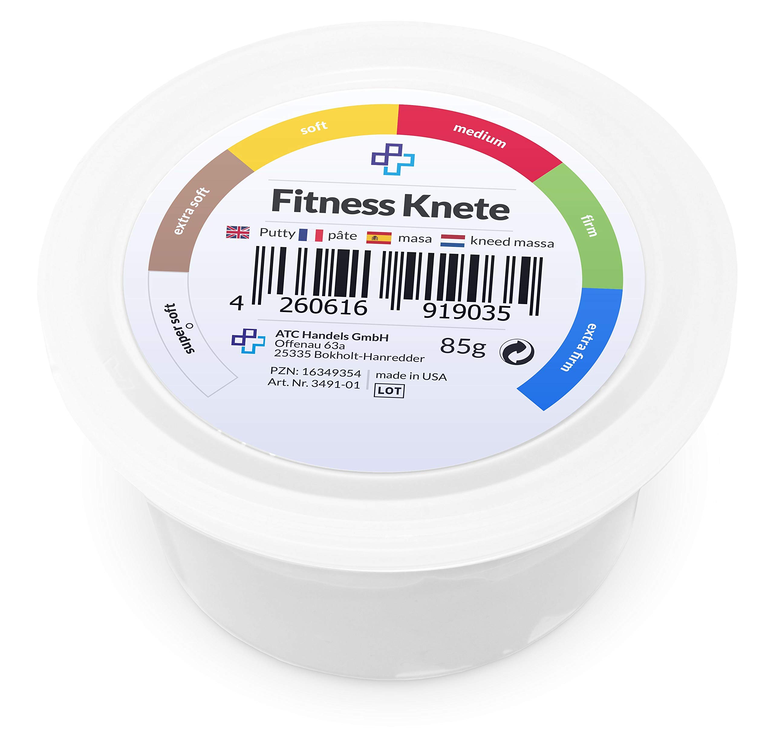 Available in different levels of resistance.Offers the possibility for individual training programs for hand and finger exercises.Here, the training can be tailored and structured. To strengthen finger mobility and the hand, arm and forearm muscles.Latex -free.stress reduction and relaxation: fitness clay can also have a calming and relaxing effect.Kneading the plasticine can help to reduce stress and to solve tensions in the hands and fingers.It offers a pleasant sensory experience and can be used as a form of relaxation.Promotion of fine motor skills: The use of fitness clets can improve fine motor skills.By manipulating and shaping the plasticine, the mobility of the fingers and the coordination of the hand muscles are encouraged, which can have a positive effect on activities such as writing, typing or gripping small objects.Strengthening the hand muscles: The hand muscles can be strengthened by regular training with fitness clays.Kneading and shaping the plasticine requires effort from the fingers and hands, which can lead to an improvement in griffiness and finger power.versatility: fitness clay is an extremely versatile training tool.It can be used anywhere, be it at home, in the office or on the go.In addition, it is suitable for people of all ages and can be used for different training goals.Formability: Fitness clay can be extremely formable and can easily be brought into different shapes.It can be stretched, kneading, squeezing and shaping to enable a variety of exercises and hand movements.In unterschiedlichen Widerstandsgraden erhältlich. Bietet die Möglichkeit für individuelle Trainingsprogramme bei Hand- und Fingerübungen. Hierbei kann das Training gezielt abgestimmt und aufgebaut werden. Zur Stärkung der Fingerbeweglichkeit und der Hand-, Arm-, und Unterarmmuskulatur. Latexfrei.Stressabbau und Entspannung: Fitnessknete kann auch eine beruhigende und entspannende Wirkung haben. Das Kneten der Knete kann helfen, Stress abzubauen und Spannungen in den Händen und Fingern zu lösen. Es bietet eine angenehme sensorische Erfahrung und kann als Form der Entspannung genutzt werden. Förderung der Feinmotorik: Die Verwendung von Fitnessknete kann die Feinmotorik verbessern. Durch das Manipulieren und Formen der Knete werden die Beweglichkeit der Finger und die Koordination der Handmuskeln gefördert, was sich positiv auf Aktivitäten wie Schreiben, Tippen oder das Greifen kleiner Gegenstände auswirken kann. Stärkung der Handmuskulatur: Durch regelmäßiges Training mit Fitnessknete können die Handmuskeln gestärkt werden. Das Kneten und Formen der Knete erfordert Anstrengung von den Fingern und Händen, was zu einer Verbesserung der Greiffähigkeit und der Fingerkraft führen kann. Vielseitigkeit: Fitnessknete ist ein äußerst vielseitiges Trainingswerkzeug. Sie kann überall verwendet werden, sei es zu Hause, im Büro oder unterwegs. Darüber hinaus eignet sie sich für Menschen jeden Alters und kann für unterschiedliche Trainingsziele genutzt werden. Formbarkeit: Fitnessknete ist äußerst formbar und kann leicht in verschiedene Formen gebracht werden. Sie lässt sich dehnen, kneten, zusammendrücken und formen, um eine Vielzahl von Übungen und Handbewegungen zu ermöglichen.ATC Handels GmbH Therapieknete 85g, Putty für Handtraining, Therapie Knetmasse Knete 110g weiss, super weich
