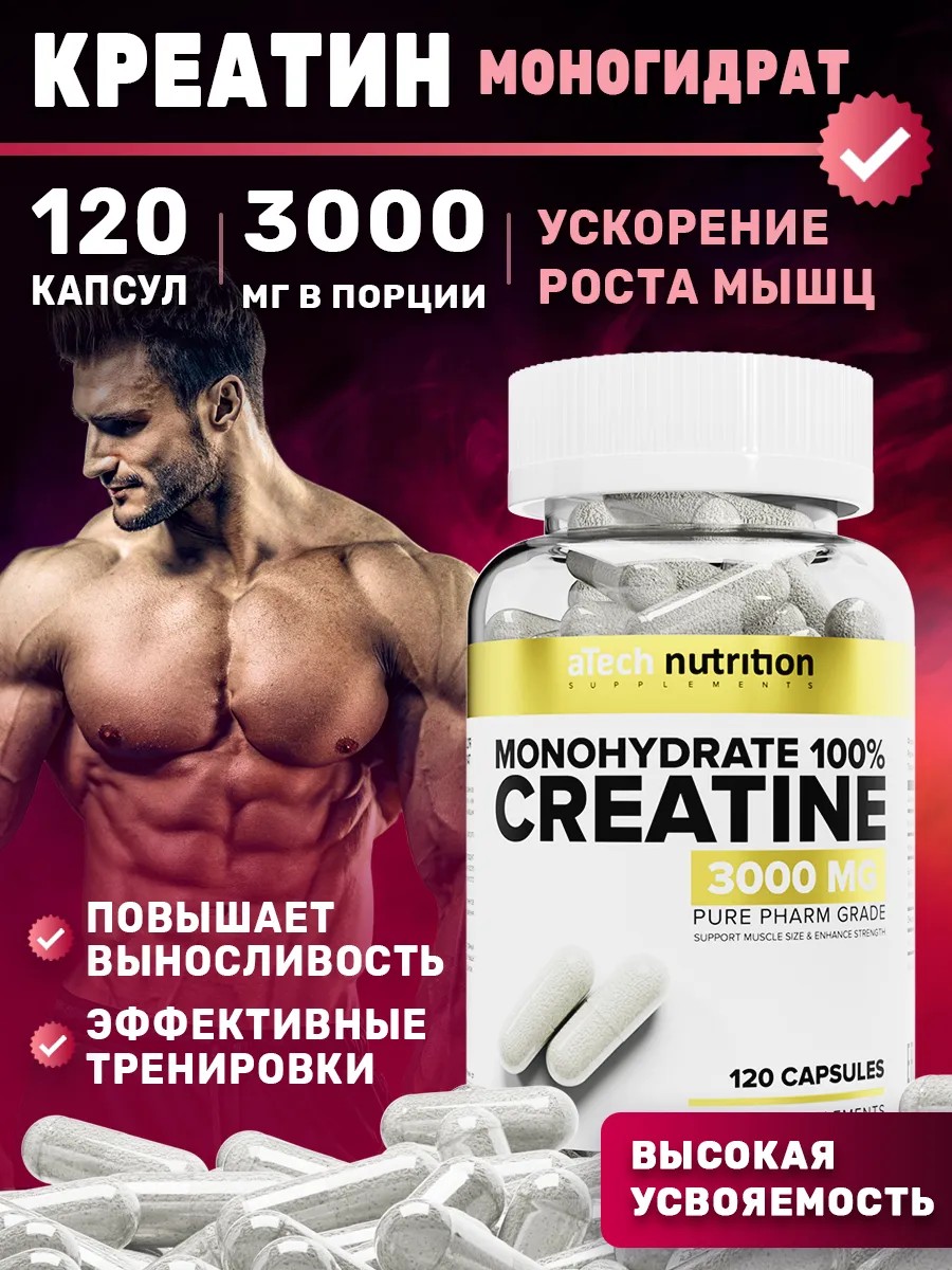 Предтренировочный комплекс creatine monohydrate 100% aTech Nutrition с транспортной системой, который влияет на значительное увеличение силы и выносливости и, как следствие, на рост мышечной массы. Высокая степень микронизации является залогом максимальной усвояемости продукта. Рекомендации: для достижения наилучшего результата принимайте creatine порошок в капсулах по следующей схеме: 10 дней - 3 раза в день по 1 порции, желательно после еды или с углеводами, последующие 20 дней по 2 порции в день. После этого желательно сделать перерыв 2-4 недели.