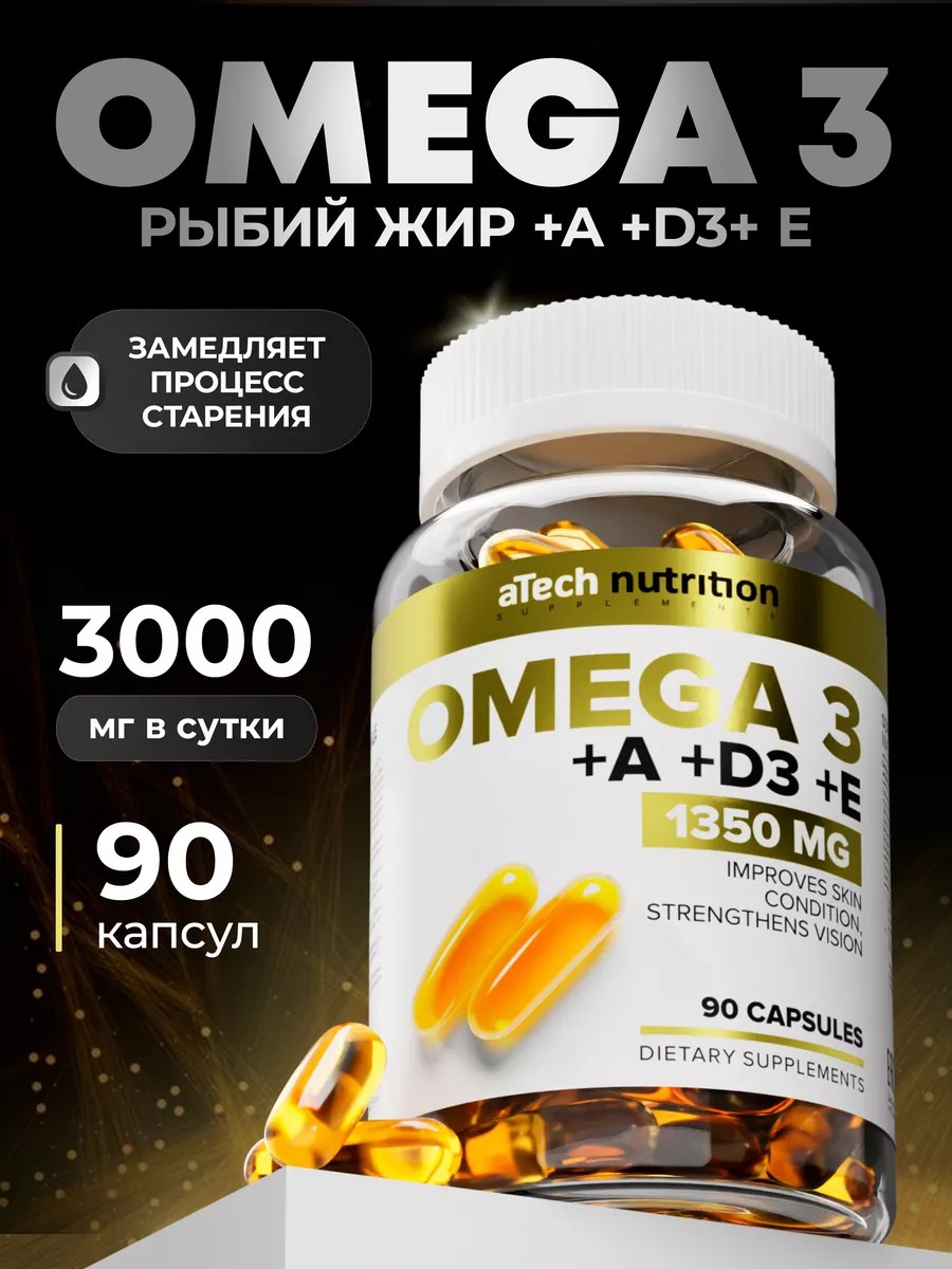 Омега 3 + Витамин Д3, А, Е витамины для взрослых в капсулах aTech nutrition - это сбалансированная добавка, насыщенная жизненно важными жирными кислотами.