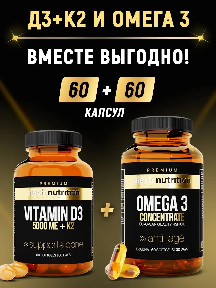 aTech nutrition Premium Набор Витамин Д3 5000 К2 и Омега 3 1000 капсулы 60 + 60