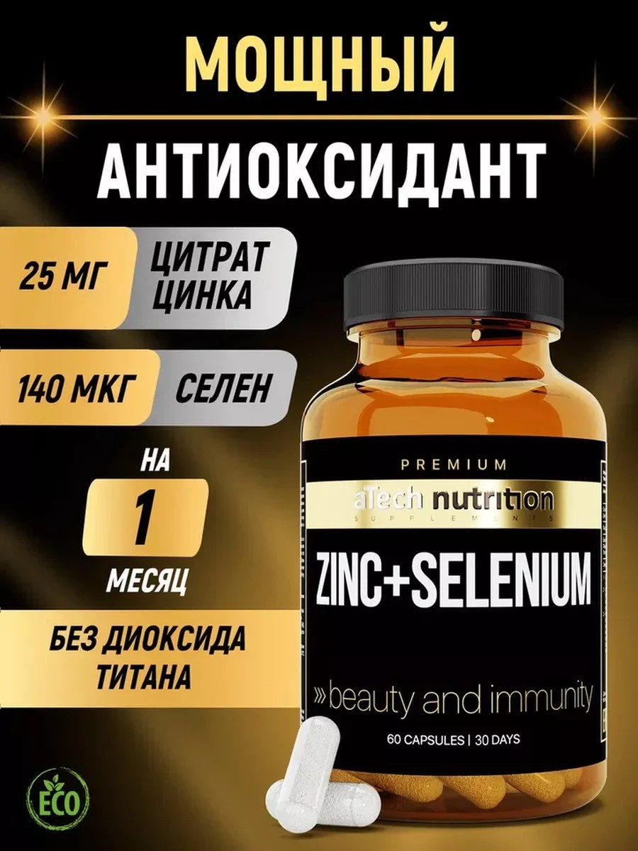 В 2 капсулах: цинк - 25 мг, селен - 140 мкг, витамин С 180 мг.Без диоксида титана. Селен и цинк — микроэлементы с антиоксидантной активностью. Они помогают организму справляться с оксидативным стрессом, который вызывает повреждения клетки и нарушает функции иммунной системы. Минералы цинк и селен крайне важны для полового и репродуктивного здоровья, как мужчин так женщин. Верный помощник при мужской потенции. Селен способствует усвоению витамина С, защищает мозг и способен предотвратить раннее развитие болезни Альцгеймера. Он нормализует энергетический обмен и работу щитовидной железы.Цитрат цинка - органическое соединение с лимонной кислотой. Отличается максимальной усвояемостью (61%) и наиболее приятным вкусом. Легко переносится, не вызывает побочных эффектов.Состав: селенит с, цинк цитрат, мальтодекстрин, витамин С, антислеживающий агент - кремния диоксид, капсула (желатин, вода).Рекомендации по применению: взрослым по 2 капсулы в день во время еды.Все продукты aTech nutrition PREMIUM изготовлены из высококлассного сырья на собственном производстве, имеют необходимые документы о качестве и безопасности. В разработке эффективной рецептуры задействована команда нутрициологов, технологов и специалистов в области биологически активных добавок. Принимая БАДы и витамины aTech nutrition PREMIUM, Вы можете быть уверены в эффективности и безопасности продукта.Премиум линейка продуктов бренда aTech nutrition PREMIUM в рознице представлена в сетевых косметических гипермаркетах, аптеках, спортивных магазинах. Выпускаются в банке из темного стекла с защитной мембраной, на крышке имеется защита от вскрытия.БАД — биологически активные вещества и их композиции, предназначенные для приёма с пищей или введения в состав пищевых продуктов. Они относятся к категории пищевых продуктов. Используются как дополнительный источник биологически активных веществ (пищевых волокон, витаминов, минеральных веществ, аминокислот) для ликвидации их дефицита и оптимизации рациона.БАД, не является лекарственным средством. Перед приемом проконсультируйтесь с врачом.