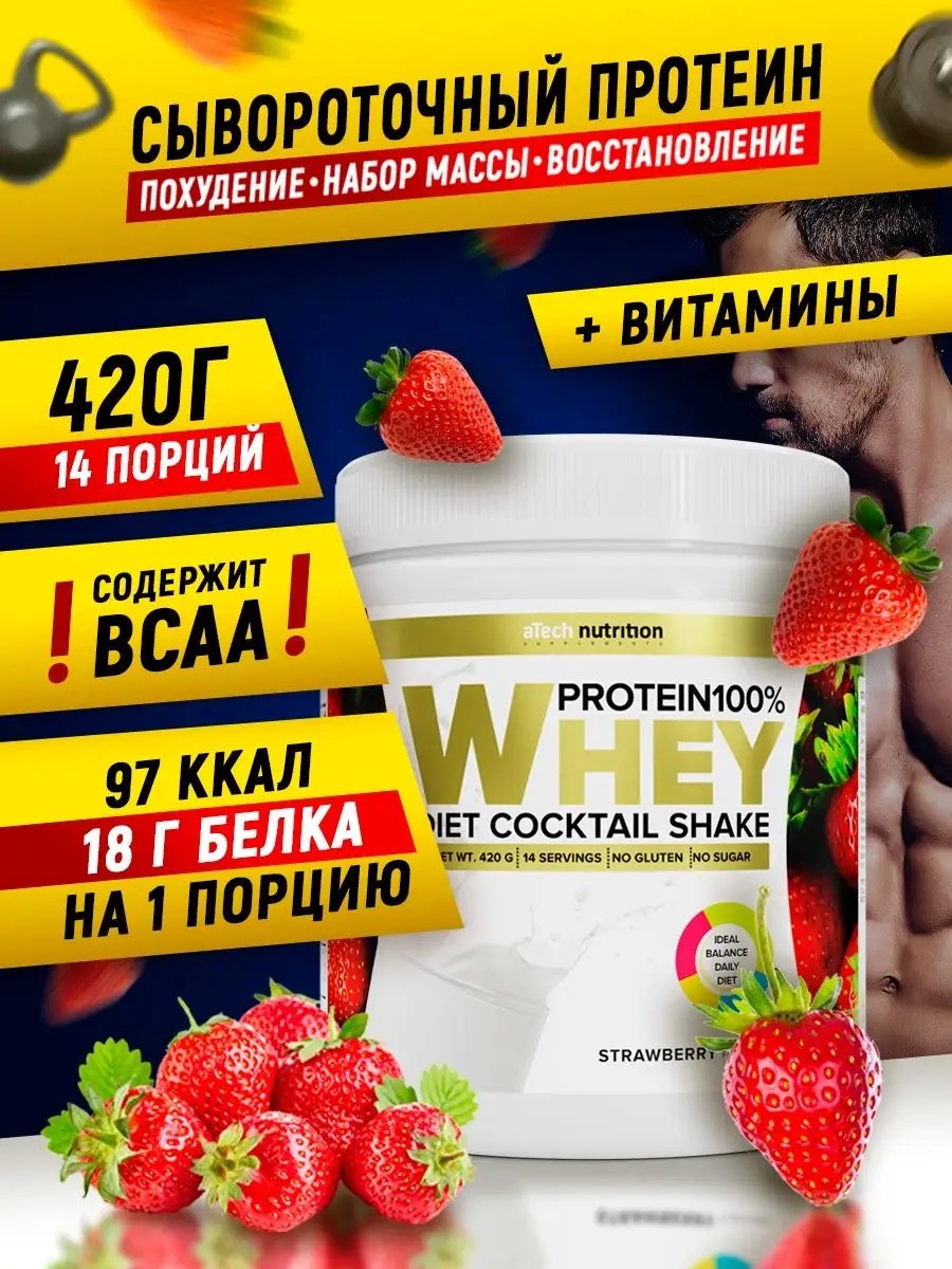 Белковый витаминный коктейль Whey со вкусом и кусочками клубники и банана, 420гр ТМ aTech nutrition - это пп низкокалорийный продукт (всего 97 ккал на порцию!), рекомендуется в качестве дополнительного источника белка к основному рациону для оптимизации питания при сбалансированной диете, здоровом образе жизни и для лучшего восстановления после физических нагрузок. Этот протеин применим в любой спортивной программе: для похудения и набора мышечной массы, набора массы, в программе восстановления, а благодаря своей низко калорийности - и для похудения. Не содержит глютена без ГМО. Все коктейли производятся без добавления сахара, вместо него в качестве подсластителя используется сукралоза, данный подсластитель высоко оценивается в спортивной индустрии, т.к. не содержит калории и остается низкоуглеводным. Рекомендации по употреблению: для достижения максимального эффекта принимать по одной порции - 30 г (две мерные ложки) продукта до трех раз в день между приемами пищи или в соответствии с Вашей индивидуальной программой правильного питания!