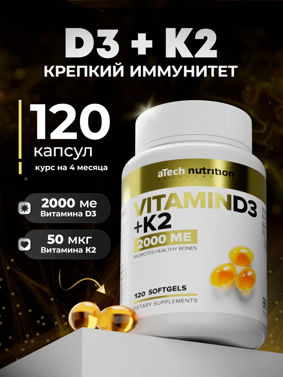 aTech nutrition Витамин Д3 К2 2000 120 капсул для иммунитета
