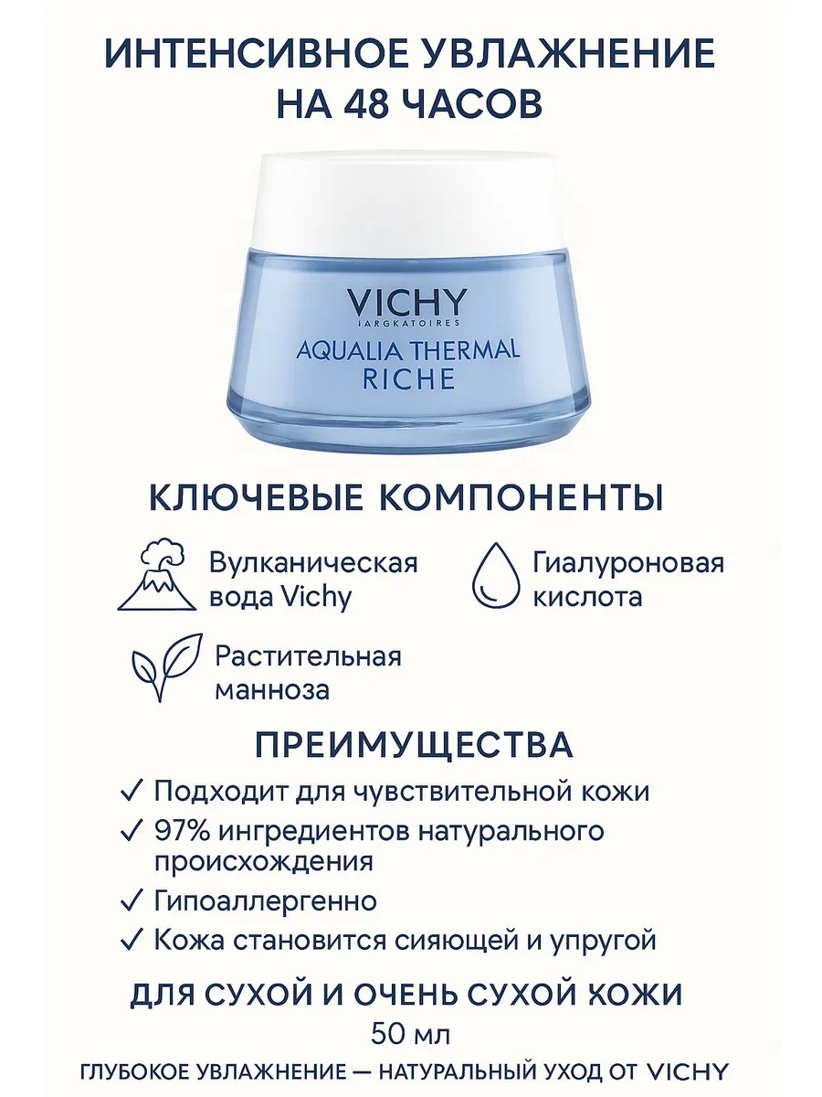 Увлажняющий крем Vichy Aqualia Thermal Riche создан специально для сухой и очень сухой кожи. Обеспечивает глубокое увлажнение до 48 часов, мгновенно устраняет чувство стянутости и сухости, придаёт коже мягкость, эластичность и сияние.