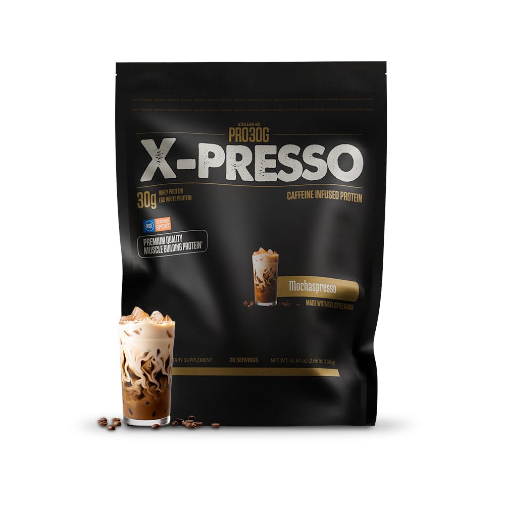 Trusted Brand: Developed by ATHLEAN-X, a leader in fitness and nutrition, ensuring you get a top-quality product backed by science and fitness expertise. SCIENCE-BASED PROTEIN: PRO-30G provides a your full daily requirement that is essential to muscle growth and maintenance of muscle mass. EASY TO MIX: Say goodbye to clumpy shakes. PRO 30G protein powder mixes smoothly with water, milk, or your favorite beverage for a creamy, delicious shake every time. HIGH PROTEIN CONTENT: Each serving delivers 30 grams of premium whey protein to support muscle recovery, growth, and maintenance, making it ideal for athletes looking to enhance their performance. CAFFEINE TO BOOST YOUR ENERGY: Every serving of Xpresso contains at least 150mg of Caffiene to boost your energy, mood, and brain function.