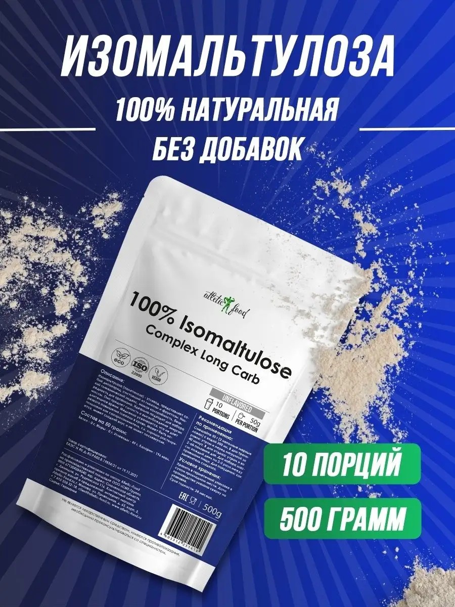 Isomaltulose (palatinose) is a carbohydrate, a disaccharide consisting of glucose and fructose. Low glycemic index, low calorie content, harmless to the body. Ideal for gaining weight. Provides satiety and releases energy over a long period of time. It is slowly absorbed, which does not cause a sharp increase in glucose in the blood. Can be used as a sugar substitute, as it dissolves well, has a sweet taste and no aftertaste. Does not cause dental caries. The drug has a positive effect on the athlete's body during "drying". It also belongs to dietary products. This allows it to be widely used during weight loss. On training days: in the morning and 40 minutes before exercise. On rest days: in the morning and in the afternoon. / weight gain / carbohydrates / muscle growth / for energy / energy / endurance / strength / performance / for endurance / gainer / mass / gainer. The "Athletic Food" chain of stores specializing in health, sports, and beauty.