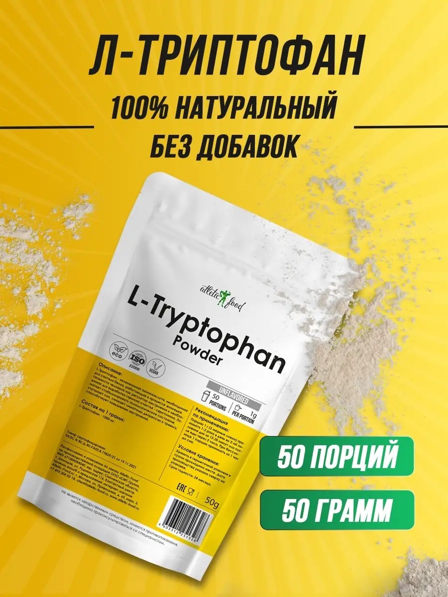 L-Tryptophan is an amino acid supplement that helps stabilize your psychological state, combat anxiety, and promote normal rest. 1. Reduces emotional stress, promoting relaxation. 2. Improves sleep quality in cases of sleep onset disorders associated with decreased serotonin secretion. 3. Reduces symptoms of depression and decreases susceptibility to stress. 4. Regulates eating behavior, promoting reduced food intake and reduced carbohydrate cravings in conditions of serotonin deficiency. 5. Improves mood in cases of chronic stress. In addition, it belongs to the group of essential amino acids necessary for protein synthesis. One of the functions of tryptophan is its participation in the synthesis of body proteins, including muscle proteins. Tryptophan is one of the 20 amino acids that make up all the proteins in our body. In addition, the amino acid L-tryptophan is a precursor of certain hormones, such as serotonin and melatonin. Serotonin is involved in the regulation of many bodily functions. In particular, it regulates pain perception. A serotonin deficiency increases the pain threshold, making a person more sensitive to mild stimuli. Serotonin also increases vascular tone (acting as a vasoconstrictor). This hormone also regulates blood clotting: without it, blood loses its ability to clot. Serotonin affects the digestive tract, reproductive system, and other organs and functions. Therefore, a tryptophan deficiency reduces serotonin production, leading to symptoms of depression. Serotonin is the hormone that produces melatonin, which is responsible for normal sleep. Therefore, insomnia can develop if the body doesn't get enough tryptophan. Another benefit of tryptophan is that it helps the intestinal microflora produce niacin, a vitamin B3 that is responsible for healthy skin, lowers cholesterol, and improves cerebral circulation. For an athlete, it is important that taking tryptophan allows you to: improve sleep and quality of rest, avoiding overtraining; get rid of anxiety and symptoms of depression; lower the pain threshold and improve motor activity; strengthen the immune system; reduce appetite, lower the amount of cholesterol in the blood. Tryptophan helps to maintain psychological stability, recover faster after training, and rest normally. To eliminate the symptoms of depression and prevent vitamin B3 deficiency, you can take tryptophan during the day, once or divided into 2-3 doses, at a dosage of 1000-1500 mg per day. Composition per serving (1 g): L-Tryptophan - 1000 mg. Other ingredients: none. Tryptophan, tryptophan 500 mg, tryptophan 1000 mg, l-tryptophan, tryptophan powder, l tryptophan, l-tryptophan, l-tryptophan, for depression, antidepressants, for insomnia. The "Athletic Food" chain of stores specializing in health, sports, and beauty.