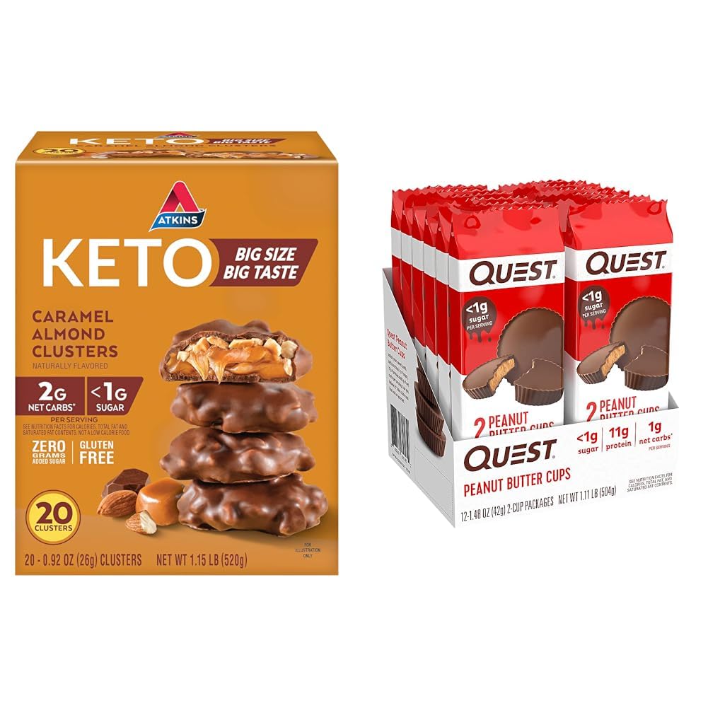 Atkins Caramel Almond Clusters Gluten Free High in Fiber & Quest Nutrition High Protein Low Carb Gluten Free Keto Friendly Peanut Butter Cups 12 Count (Pack of 1) (total- 17.76 Ounce)