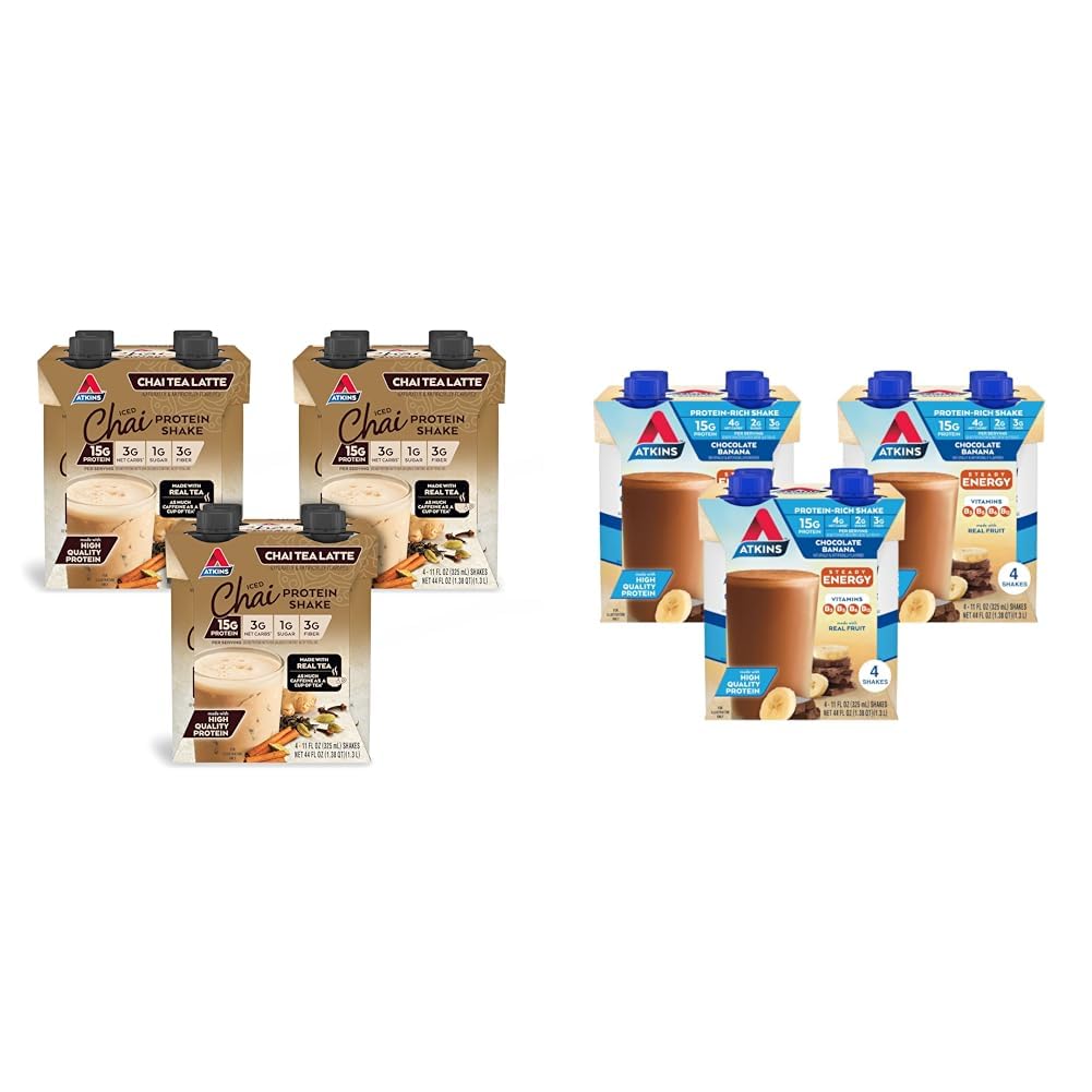 This protein shake bundle includes Atkins Chai Tea Latte and Chocolate Banana flavored shakes to complement your active, low-carb lifestyle. The Chai Tea Latte shakes provide the invigorating caffeine kick of a cup of tea with 15g protein, 3g net carbs, and 1g sugar per 16.9 oz bottle. They feature the spiced chai tea flavor in a delicious gluten-free, keto-friendly shake. The Chocolate Banana shakes offer a sweet chocolate and banana flavor with 15g protein, 4g net carbs, and 2g sugar per 11 oz bottle. They make a tasty low-carb choice when you're on-the-go. Both shakes are specially formulated to be low in sugar and net carbs. They help satisfy hunger while supporting a ketogenic diet. As a bundle, they provide a variety of flavors to delight your tastebuds while nourishing your body with quality protein and nutrients. Sip these shakes at home or take them along in your busy day to help you stay energized and on track with your health goals.