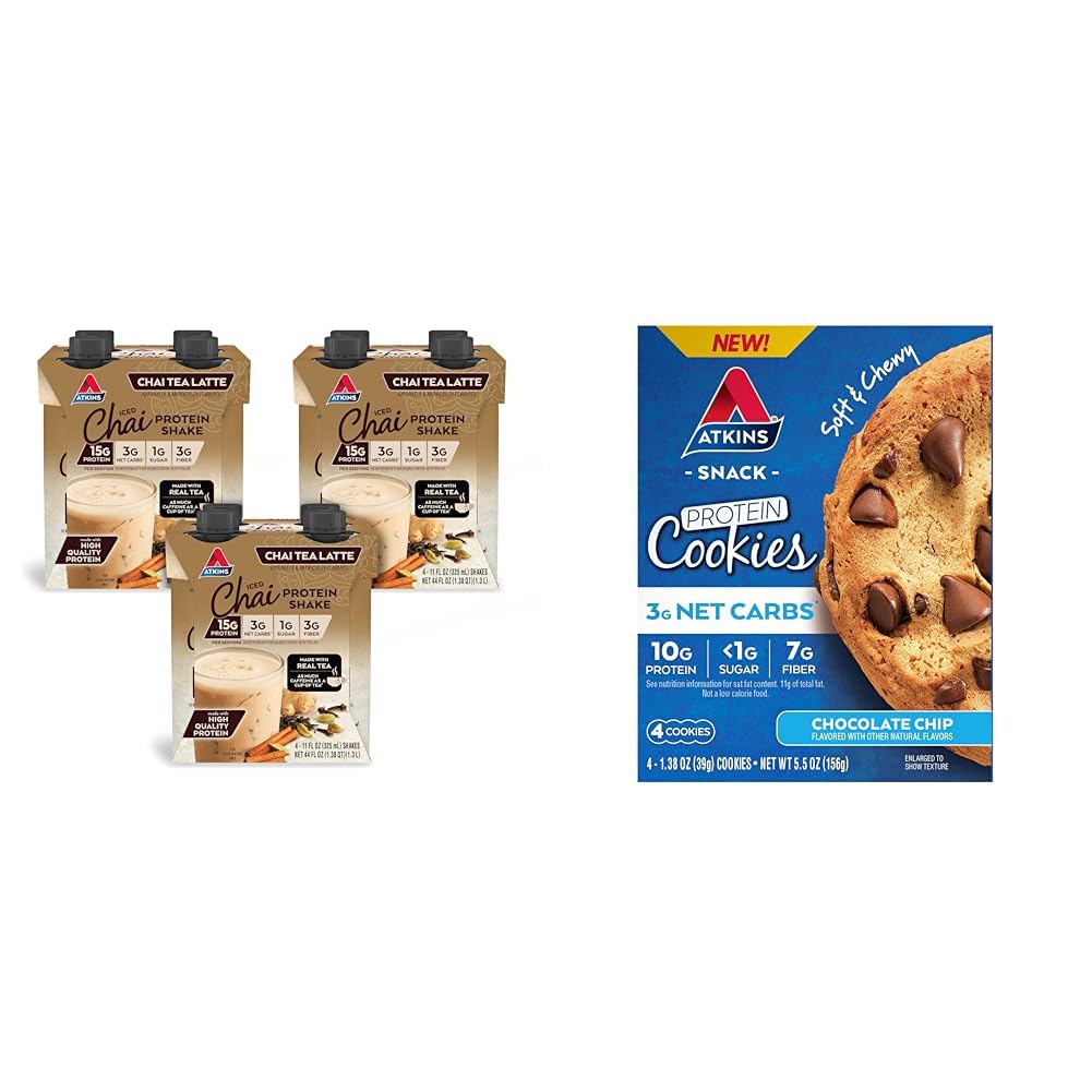 The Atkins protein shake and cookie bundle pairs a chai tea latte flavored protein shake with chocolate chip protein cookies for a tasty low carb snack combo. The protein shake provides 15g of protein, 3g net carbs, 1g sugar, and caffeine comparable to a cup of coffee per 16.9oz bottle. With four bottles per carton, it offers a gluten-free, keto-friendly way to get protein, fiber, and an energizing boost. Meanwhile, the chocolate chip cookies serve up 10g protein, 3g net carbs, and 1g sugar per 1.38oz cookie. With four individually wrapped cookies per carton, they provide a soft, chewy sweet treat. Together, these components offer the nutrition of Atkins' low glycemic, low sugar formulas in both drinkable and snackable form. The shake brings protein, caffeine, and the spice of chai tea latte flavor for an invigorating pick-me-up. The cookies complement with a classic chocolate chip cookie taste that satisfies cravings without excess carbs or sugar. With high protein and fiber plus low net carbs and sugar, this bundle fits into a keto lifestyle or any health-conscious diet seeking delicious flavor.Delicious flavors like Chai Tea Latte and Chocolate Chip make it easy to stay true to your healthy lifestyle. Both shakes and cookies are low carb, low sugar, keto friendly snacks made with quality ingredients. Bundle includes 3 cartons of Atkins Chai Tea Latte Protein Shakes (4 bottles per carton) and 4-count carton of Atkins Chocolate Chip Protein Cookies. Atkins Chocolate Chip Protein Cookies provide 10g protein, 3g net carbs, 1g sugar per cookie for a sweet, fiber-rich snack. Atkins Chai Tea Latte Protein Shakes offer 15g protein, 3g net carbs, 1g sugar per serving, and as much caffeine as a cup of coffee to help keep you satisfied.
