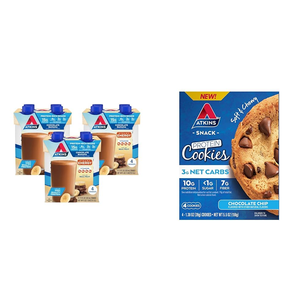 Stay true to your low carb lifestyle with the delicious flavors of Atkins protein shakes and cookies. Shakes offered in 3 cartons each containing 4 individually bottled 11 fl oz servings cookies offered in 4ct cartons with individually wrapped 1.38oz cookies. Both shakes and cookies are keto-friendly and pack protein to help give your body the nutrients it needs without a ton of sugar or net carbs. Indulge in chewy Atkins Chocolate Chip Protein Cookies with 10g protein, 3g net carbs, and 1g sugar per cookie to treat your sweet tooth. Enjoy delicious Atkins Chocolate Banana Protein Shakes with 15g protein, 4g net carbs, and 2g sugar per serving to help satisfy hunger on-the-go.