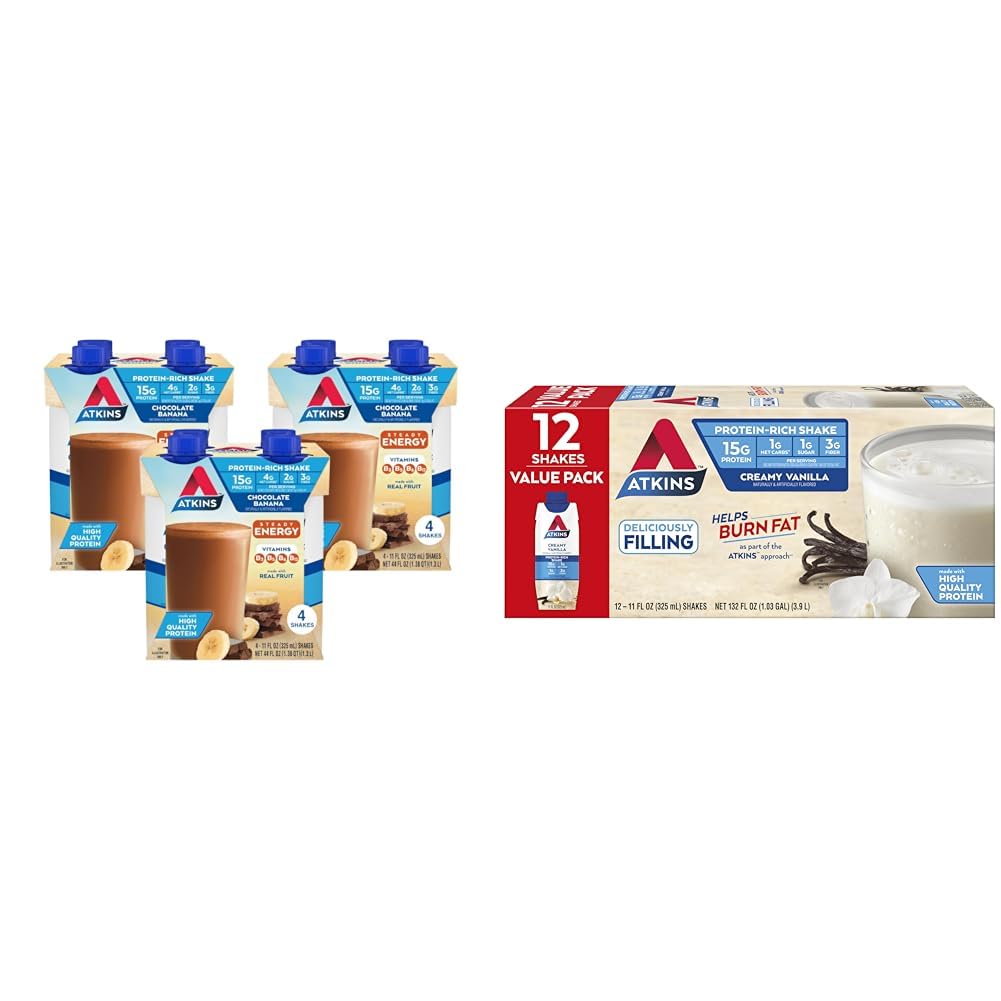 Atkins Chocolate Banana Protein Shake, 15g Protein, Low Glycemic, 4g Net Carb, 2g Sugar, Keto Friendly, 12 Count Enjoy Atkins™ Chocolate Banana Protein Shakes. Each delicious gluten free chocolate banana flavored shake delivers 15g of protein to satisfy your hunger and keep you moving. These low sugar , low carb shakes are a great choice for when you're on the go but don't want to sacrifice great taste or settle for something with a ton of sugar or net carbs. Atkins Chocolate Banana Protein Shakes are keto friendly , a good source of fiber and have 4g of net carbs and 2g of sugar per serving . Atkins Creamy Vanilla Protein Shake, 15g Protein, Low Glycemic, 2g Net Carb, 1g Sugar, Keto Friendly, 12 Count Enjoy Atkins™ Creamy Vanilla Protein Shakes. Each delicious creamy vanilla flavored protein shake delivers 15g of protein to satisfy your hunger and keep you moving. These low sugar , low carb creamy shakes are a great choice for when you're on the go but don't want to sacrifice great taste or settle for something with a ton of sugar or net carbs. Atkins Creamy Vanilla Protein Shakes are keto friendly , a good source of fiber , contain no artificial growth hormones, and have 2g of net carbs and 1g of sugar per serving .Product 2: Offered in 12ct cartons containing individually bottled 11 fl oz shakes. Product 2: AMAZING RECIPES. Delight in the nutrients and satisfying flavors of great foods made with quality ingredients. Product 2: YOUR APPROACH. Help give your body the nutrients it needs without sacrificing your favorite flavors. Product 2: AT HOME OR ON-THE-GO. Atkins Creamy Vanilla Protein Shakes. Enjoy delicious shakes that fit right into your busy schedule, with 15g of protein, 2g of net carbs and 1g of sugar per serving . This is Today's Atkins. Product 1: Offered in 3 cartons, each containing 4 individually bottled 11 fl oz shakes. Product 1: AMAZING RECIPES. Delight in the nutrients and satisfying flavors of great foods made with quality ingredients. Product 1: YOUR APPROACH. Help give your body the nutrients it needs without sacrificing your favorite flavors. Product 1: AT HOME OR ON-THE-GO. Atkins Chocolate Banana Protein Shakes. Enjoy delicious shakes that fit right into your busy schedule, with 15g of protein, 4g of net carbs, and 2g of sugar per serving . This is Today's Atkins.