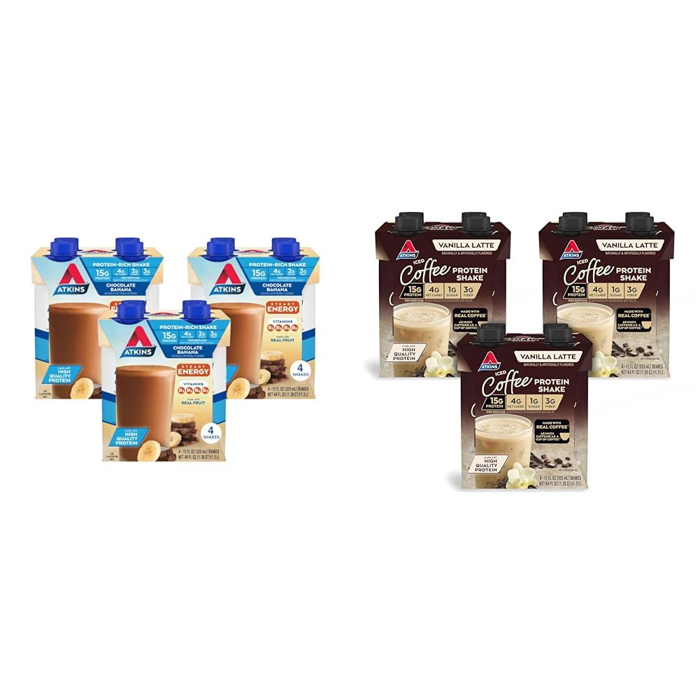 Atkins Chocolate Banana Protein Shake, 15g Protein, Low Glycemic, 4g Net Carb, 2g Sugar, Keto Friendly, 12 Count Enjoy Atkins™ Chocolate Banana Protein Shakes. Each delicious gluten free chocolate banana flavored shake delivers 15g of protein to satisfy your hunger and keep you moving. These low sugar , low carb shakes are a great choice for when you're on the go but don't want to sacrifice great taste or settle for something with a ton of sugar or net carbs. Atkins Chocolate Banana Protein Shakes are keto friendly , a good source of fiber and have 4g of net carbs and 2g of sugar per serving . Atkins Iced Coffee Vanilla Latte Protein Shake, 15g Protein, Low Glycemic, 4g Net Carb, 1g Sugar, Keto Friendly, 3 PACK Atkins™ Vanilla Latte flavored Iced Coffee Protein Shakes are low sugar , low carb and bring together the invigorating taste of vanilla latte flavor and the enlivening kick of a cup of coffee in a delicious protein shake. There's nothing quite like a gluten free, low glycemic protein shake with the great taste of a vanilla latte and the caffeine of a cup of coffee to get you going, with 15g of protein, 4g of net carbs, and 1g of sugar per serving . They're also keto friendly , a good source of fiber and contain no artificial growth hormones.Product 2: Offered in 4ct cartons containing individually bottled 11 fl oz shakes. Product 2: AMAZING RECIPES. Delight in the nutrients and satisfying flavors of great foods made with quality ingredients. Product 2: YOUR APPROACH. Help give your body the nutrients it needs without sacrificing your favorite flavors. Product 2: AT HOME OR ON-THE-GO. Atkins Vanilla Latte Iced Coffee Protein Shakes. Enjoy delicious shakes that fit right into your busy schedule, with 15g of protein, 4g of net carbs, 1g of sugar per serving , and as much caffeine as a cup of coffee. This is Today's Atkins. Product 1: Offered in 3 cartons, each containing 4 individually bottled 11 fl oz shakes. Product 1: AMAZING RECIPES. Delight in the nutrients and satisfying flavors of great foods made with quality ingredients. Product 1: YOUR APPROACH. Help give your body the nutrients it needs without sacrificing your favorite flavors. Product 1: AT HOME OR ON-THE-GO. Atkins Chocolate Banana Protein Shakes. Enjoy delicious shakes that fit right into your busy schedule, with 15g of protein, 4g of net carbs, and 2g of sugar per serving . This is Today's Atkins.