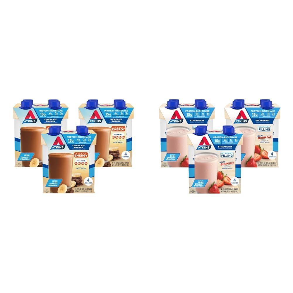 Atkins Chocolate Banana Protein Shake, 15g Protein, Low Glycemic, 4g Net Carb, 2g Sugar, Keto Friendly, 12 Count Enjoy Atkins™ Chocolate Banana Protein Shakes. Each delicious gluten free chocolate banana flavored shake delivers 15g of protein to satisfy your hunger and keep you moving. These low sugar , low carb shakes are a great choice for when you're on the go but don't want to sacrifice great taste or settle for something with a ton of sugar or net carbs. Atkins Chocolate Banana Protein Shakes are keto friendly , a good source of fiber and have 4g of net carbs and 2g of sugar per serving . Atkins Strawberry Protein Shake, 15g Protein, Low Glycemic, 2g Net Carb, 1g Sugar, Keto Friendly, 12 Count Enjoy Atkins™ Strawberry Protein Shakes. Each delicious gluten free, low glycemic strawberry flavored shake delivers 15g of protein to satisfy your hunger and keep you moving. These low sugar , low carb shakes are a great choice for when you're on the go but don't want to sacrifice great taste or settle for something with a ton of sugar or net carbs. Atkins Strawberry Protein Shakes are keto friendly , a good source of fiber , contain no artificial growth hormones, and have 2g of net carbs and 1g of sugar per serving .Product 2: Offered in 4ct, 6ct (bonus pack) or 12ct cartons containing individually bottled 11 fl oz shakes. Product 2: AMAZING RECIPES. Delight in the nutrients and satisfying flavors of great foods made with quality ingredients. Product 2: YOUR APPROACH. Help give your body the nutrients it needs without sacrificing your favorite flavors. Product 2: AT HOME OR ON-THE-GO. Atkins Strawberry Protein Shakes. Enjoy delicious shakes that fit right into your busy schedule, with 15g of protein, 2g of net carbs, and 1g of sugar per serving . This is Today's Atkins. Product 1: Offered in 3 cartons, each containing 4 individually bottled 11 fl oz shakes. Product 1: AMAZING RECIPES. Delight in the nutrients and satisfying flavors of great foods made with quality ingredients. Product 1: YOUR APPROACH. Help give your body the nutrients it needs without sacrificing your favorite flavors. Product 1: AT HOME OR ON-THE-GO. Atkins Chocolate Banana Protein Shakes. Enjoy delicious shakes that fit right into your busy schedule, with 15g of protein, 4g of net carbs, and 2g of sugar per serving . This is Today's Atkins.
