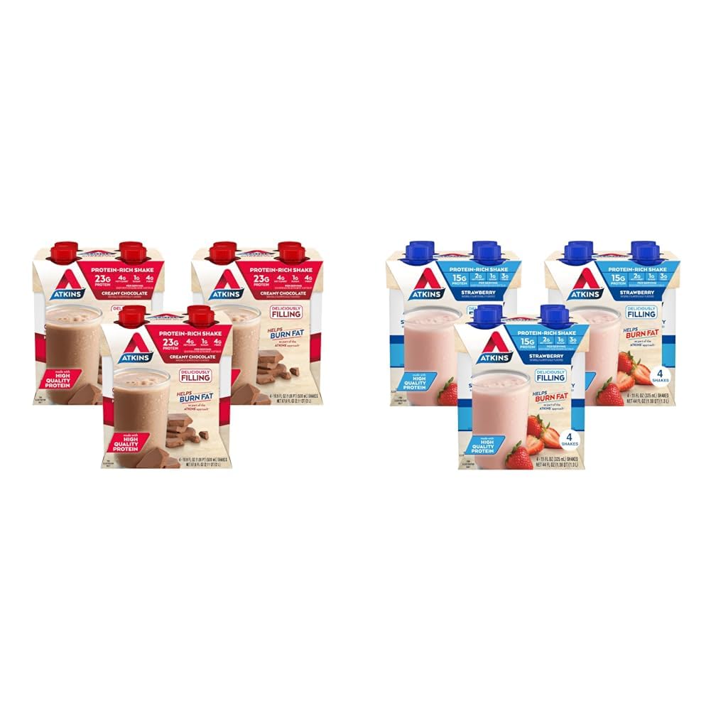 Atkins Creamy Chocolate Meal Size Protein Shake, 23g Protein, Low Glycemic, 4g Net Carb, 1g Sugar, Keto Friendly, 12 Count Enjoy Atkins™ Meal Size Creamy Chocolate Protein Shakes. Each delicious gluten free, low glycemic chocolate flavored shake has 23g of protein to satisfy your hunger and keep you moving. Low sugar , low carb meal size creamy chocolate flavored shakes are a great choice at meal time or when you're on the go but don't want to sacrifice great taste or settle for something with a ton of sugar or net carbs. These Atkins shakes are keto friendly , a good source of fiber , contain no artificial growth hormones, and have 4g of net carbs and 1g of sugar per serving . Atkins Strawberry Protein Shake, 15g Protein, Low Glycemic, 2g Net Carb, 1g Sugar, Keto Friendly, 12 Count Enjoy Atkins™ Strawberry Protein Shakes. Each delicious gluten free, low glycemic strawberry flavored shake delivers 15g of protein to satisfy your hunger and keep you moving. These low sugar , low carb shakes are a great choice for when you're on the go but don't want to sacrifice great taste or settle for something with a ton of sugar or net carbs. Atkins Strawberry Protein Shakes are keto friendly , a good source of fiber , contain no artificial growth hormones, and have 2g of net carbs and 1g of sugar per serving .Product 2: Offered in 4ct, 6ct (bonus pack) or 12ct cartons containing individually bottled 11 fl oz shakes. Product 2: AMAZING RECIPES. Delight in the nutrients and satisfying flavors of great foods made with quality ingredients. Product 2: YOUR APPROACH. Help give your body the nutrients it needs without sacrificing your favorite flavors. Product 2: AT HOME OR ON-THE-GO. Atkins Strawberry Protein Shakes. Enjoy delicious shakes that fit right into your busy schedule, with 15g of protein, 2g of net carbs, and 1g of sugar per serving . This is Today's Atkins. Product 1: Offered in 3 cartons, each containing 4 individually bottled 16.9 fl oz shakes. Product 1: AMAZING RECIPES. Delight in the nutrients and satisfying flavors of great foods made with quality ingredients. Product 1: YOUR APPROACH. Help give your body the nutrients it needs without sacrificing your favorite flavors. Product 1: AT HOME OR ON-THE-GO. Atkins Meal Size Creamy Chocolate Protein Shakes. Enjoy delicious shakes that fit right into your busy schedule, with 23g of protein, 4g of net carbs, and 1g of sugar per serving . This is Today's Atkins.