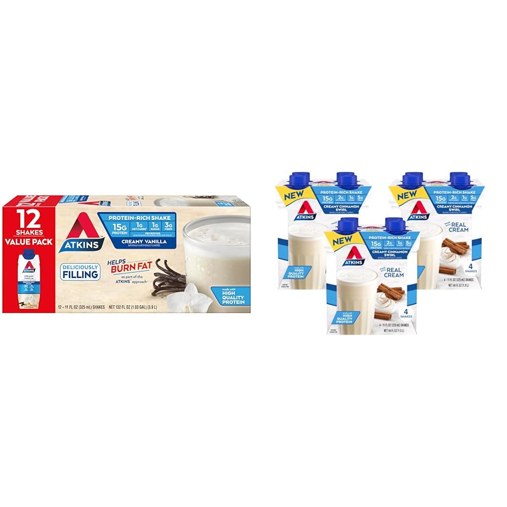 This protein shake bundle from Atkins includes both creamy vanilla and creamy cinnamon swirl flavors. Each 11 oz bottle contains 15g of protein to help keep you satisfied. With only 2g of net carbs and 1g of sugar per serving, these keto-friendly shakes fit into a low carb lifestyle. The vanilla shake has a delicious creamy vanilla flavor, while the cinnamon swirl offers a sweet cinnamon taste. Both shakes use real cream for an ultra-creamy texture. They are conveniently bottled for on-the-go use or enjoying at home. These Atkins protein shakes complement each other nicely - the vanilla providing a creamy base flavor and the cinnamon adding a touch of sweet spice. Together they give you delicious low carb shake options to suit any taste or craving. Drink one for breakfast to start your day or grab one for an afternoon pick-me-up. With 15g of protein, 2g net carbs, 1g sugar, and real cream per serving, this shake bundle from Atkins can help you stay satisfied while meeting your health goals.