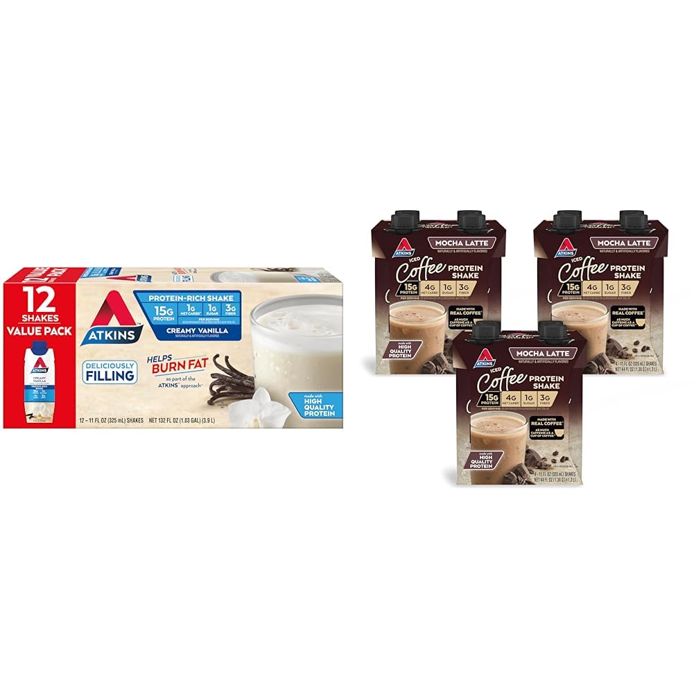 Atkins Creamy Vanilla Protein Shake, 15g Protein, Low Glycemic, 2g Net Carb, 1g Sugar, Keto Friendly, 12 Count Enjoy Atkins™ Creamy Vanilla Protein Shakes. Each delicious creamy vanilla flavored protein shake delivers 15g of protein to satisfy your hunger and keep you moving. These low sugar , low carb creamy shakes are a great choice for when you're on the go but don't want to sacrifice great taste or settle for something with a ton of sugar or net carbs. Atkins Creamy Vanilla Protein Shakes are keto friendly , a good source of fiber , contain no artificial growth hormones, and have 2g of net carbs and 1g of sugar per serving . Atkins Mocha Latte Iced Coffee Protein Shake, 15g Protein, Low Glycemic, 4g Net Carb, 1g Sugar, Keto Friendly Atkins™ Mocha Latte flavored Iced Coffee Protein Shakes are low sugar , low carb and bring together the invigorating taste of mocha latte flavor and the enlivening kick of a cup of coffee in a delicious protein shake. There's nothing quite like a gluten free, low glycemic protein shake with the great taste of a mocha latte and the caffeine of a cup of coffee to get you going, with 15g of protein, 4g of net carbs, and 1g of sugar per serving . They're also keto friendly , a good source of fiber and contain no artificial growth hormones.Product 2: Offered in 3 cartons, each containing 4 individually bottled 16.9 fl oz shakes. Product 2: AMAZING RECIPES. Delight in the nutrients and satisfying flavors of great foods made with quality ingredients. Product 2: YOUR APPROACH. Help give your body the nutrients it needs without sacrificing your favorite flavors. Product 2: AT HOME OR ON-THE-GO. Atkins Mocha Latte Iced Coffee Protein Shakes. Enjoy delicious shakes that fit right into your busy schedule, with 15g of protein, 4g of net carbs, 1g of sugar per serving , and as much caffeine as a cup of coffee. Product 1: Offered in 12ct cartons containing individually bottled 11 fl oz shakes. Product 1: AMAZING RECIPES. Delight in the nutrients and satisfying flavors of great foods made with quality ingredients. Product 1: YOUR APPROACH. Help give your body the nutrients it needs without sacrificing your favorite flavors. Product 1: AT HOME OR ON-THE-GO. Atkins Creamy Vanilla Protein Shakes. Enjoy delicious shakes that fit right into your busy schedule, with 15g of protein, 2g of net carbs and 1g of sugar per serving . This is Today's Atkins.