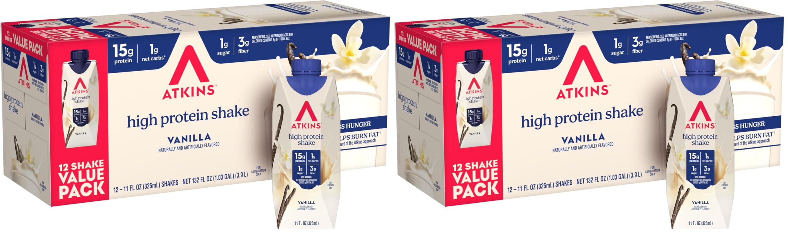 CONVENIENT ON-THE-GO NUTRITION - Comes in a 12-pack with 11 fl. oz shakes, great for portion control and easy, on-the-go snacking. READY TO DRINK CONVENIENCE - Individually packaged so you can enjoy breakfast protein shakes at home, on the go, or post-workout. CLINICALLY PROVEN SUPPORT - Clinically proven to help you lose weight when used as part of your Atkins weight loss plan. KETO-FRIENDLY SHAKES - Designed for those searching for keto protein shakes that fit seamlessly into your daily routine. DELICIOUS VANILLA FLAVOR - Satisfy cravings with rich vanilla flavored protein shakes designed for breakfast or mid-day energy, great as a ready to drink option anytime. HIGH PROTEIN SHAKES - Each serving provides 15g protein to support your nutrition goals, making these a mindful choice among protein shakes for weight loss support. The information below is per-pack only.