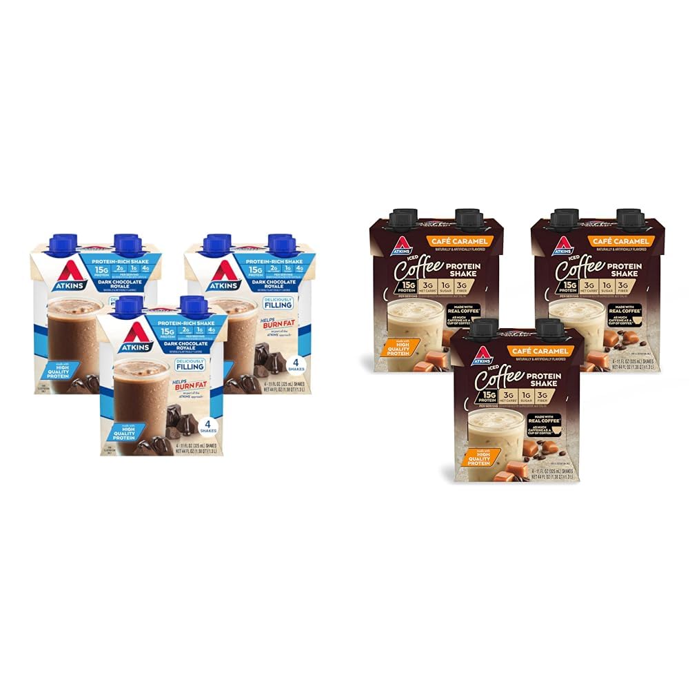 Atkins Dark Chocolate Royale Protein Shake, 15g Protein, Low Glycemic, 2g Net Carb, 1g Sugar, Keto Friendly, 12 Count Enjoy Atkins™ Dark Chocolate Royale Protein Shakes. Each delicious dark chocolate flavored shake delivers 15g of protein to satisfy your hunger and keep you moving. These low sugar , low carb shakes are a great choice for when you're on the go but don't want to sacrifice great taste or settle for something with a ton of sugar or net carbs. Atkins Dark Chocolate Royale Protein Shakes are keto friendly , a good source of fiber , contain no artificial growth hormones, and have 2g of net carbs and 1g of sugar per serving . AtkinsCafé Caramel Iced Coffee Protein Shake, 15g Protein, Low Glycemic, 3g Net Carb, 1g Sugar, Keto Friendly Atkins™ Café Caramel flavored Iced Coffee Protein Shakes are low sugar , low carb and bring together the indulgent taste of caramel flavor and the enlivening kick of a cup of coffee in a delicious protein shake. There's nothing quite like a gluten free, low glycemic protein shake with the great taste of caramel and the caffeine of a cup of coffee to get you going, with 15g of protein, 3g of net carbs, and 1g of sugar per serving . They're also keto friendly , a good source of fiber and contain no artificial growth hormones.Product 2: Offered in 3 cartons, each containing 4 individually bottled 16.9 fl oz shakes. Product 2: AMAZING RECIPES. Delight in the nutrients and satisfying flavors of great foods made with quality ingredients. Product 2: YOUR APPROACH. Help give your body the nutrients it needs without sacrificing your favorite flavors. Product 2: AT HOME OR ON-THE-GO. Atkins Café Caramel Iced Coffee Protein Shakes. Enjoy delicious shakes that fit right into your busy schedule, with 15g of protein, 3g of net carbs, 1g of sugar per serving , and as much cafeine as a cup of coffee. Product 1: Offered in 3 cartons, each containing 4 individually bottled 11 fl oz shakes. Product 1: AMAZING RECIPES. Delight in the nutrients and satisfying flavors of great foods made with quality ingredients. Product 1: YOUR APPROACH. Help give your body the nutrients it needs without sacrificing your favorite flavors. Product 1: AT HOME OR ON-THE-GO. Atkins Dark Chocolate Royale Protein Shakes. Enjoy delicious shakes that fit right into your busy schedule, with 15g of protein, 2g of net carbs, and 1g of sugar per serving. This is Today's Atkins.