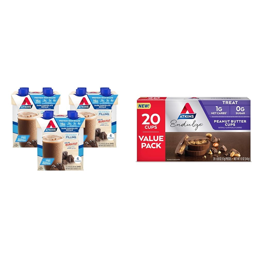 Atkins Dark Chocolate Royale Protein Shake 15g Protein Low Glycemic 2g Net Carb 1g Sugar Keto Friendly 12 Count & Endulge Peanut Butter Cups Dessert Favorite Low Carb 0g Sugar 20 Count