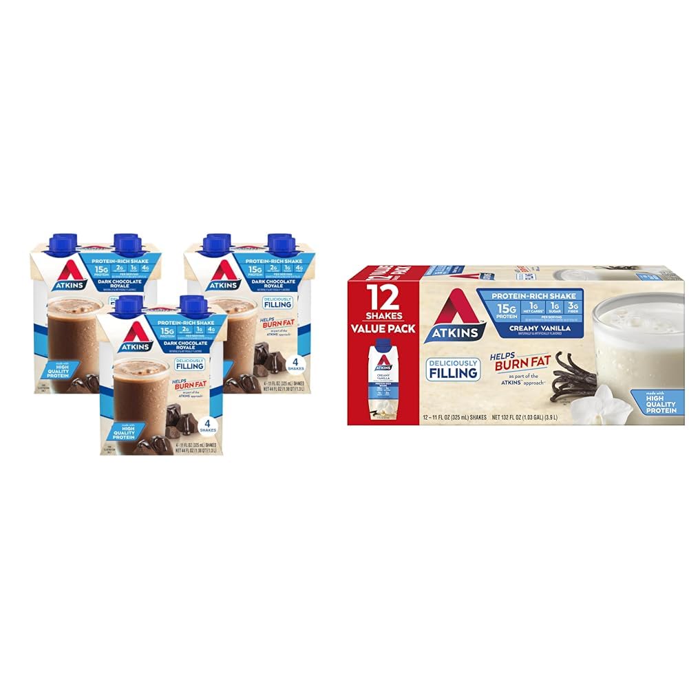Atkins Dark Chocolate Royale Protein Shake, 15g Protein, Low Glycemic, 2g Net Carb, 1g Sugar, Keto Friendly, 12 Count Enjoy Atkins™ Dark Chocolate Royale Protein Shakes. Each delicious dark chocolate flavored shake delivers 15g of protein to satisfy your hunger and keep you moving. These low sugar , low carb shakes are a great choice for when you're on the go but don't want to sacrifice great taste or settle for something with a ton of sugar or net carbs. Atkins Dark Chocolate Royale Protein Shakes are keto friendly , a good source of fiber , contain no artificial growth hormones, and have 2g of net carbs and 1g of sugar per serving . Atkins Creamy Vanilla Protein Shake, 15g Protein, Low Glycemic, 2g Net Carb, 1g Sugar, Keto Friendly, 12 Count Enjoy Atkins™ Creamy Vanilla Protein Shakes. Each delicious creamy vanilla flavored protein shake delivers 15g of protein to satisfy your hunger and keep you moving. These low sugar , low carb creamy shakes are a great choice for when you're on the go but don't want to sacrifice great taste or settle for something with a ton of sugar or net carbs. Atkins Creamy Vanilla Protein Shakes are keto friendly , a good source of fiber , contain no artificial growth hormones, and have 2g of net carbs and 1g of sugar per serving .Product 2: Offered in 12ct cartons containing individually bottled 11 fl oz shakes. Product 2: AMAZING RECIPES. Delight in the nutrients and satisfying flavors of great foods made with quality ingredients. Product 2: YOUR APPROACH. Help give your body the nutrients it needs without sacrificing your favorite flavors. Product 2: AT HOME OR ON-THE-GO. Atkins Creamy Vanilla Protein Shakes. Enjoy delicious shakes that fit right into your busy schedule, with 15g of protein, 2g of net carbs and 1g of sugar per serving . This is Today's Atkins. Product 1: Offered in 3 cartons, each containing 4 individually bottled 11 fl oz shakes. Product 1: AMAZING RECIPES. Delight in the nutrients and satisfying flavors of great foods made with quality ingredients. Product 1: YOUR APPROACH. Help give your body the nutrients it needs without sacrificing your favorite flavors. Product 1: AT HOME OR ON-THE-GO. Atkins Dark Chocolate Royale Protein Shakes. Enjoy delicious shakes that fit right into your busy schedule, with 15g of protein, 2g of net carbs, and 1g of sugar per serving . This is Today's Atkins.