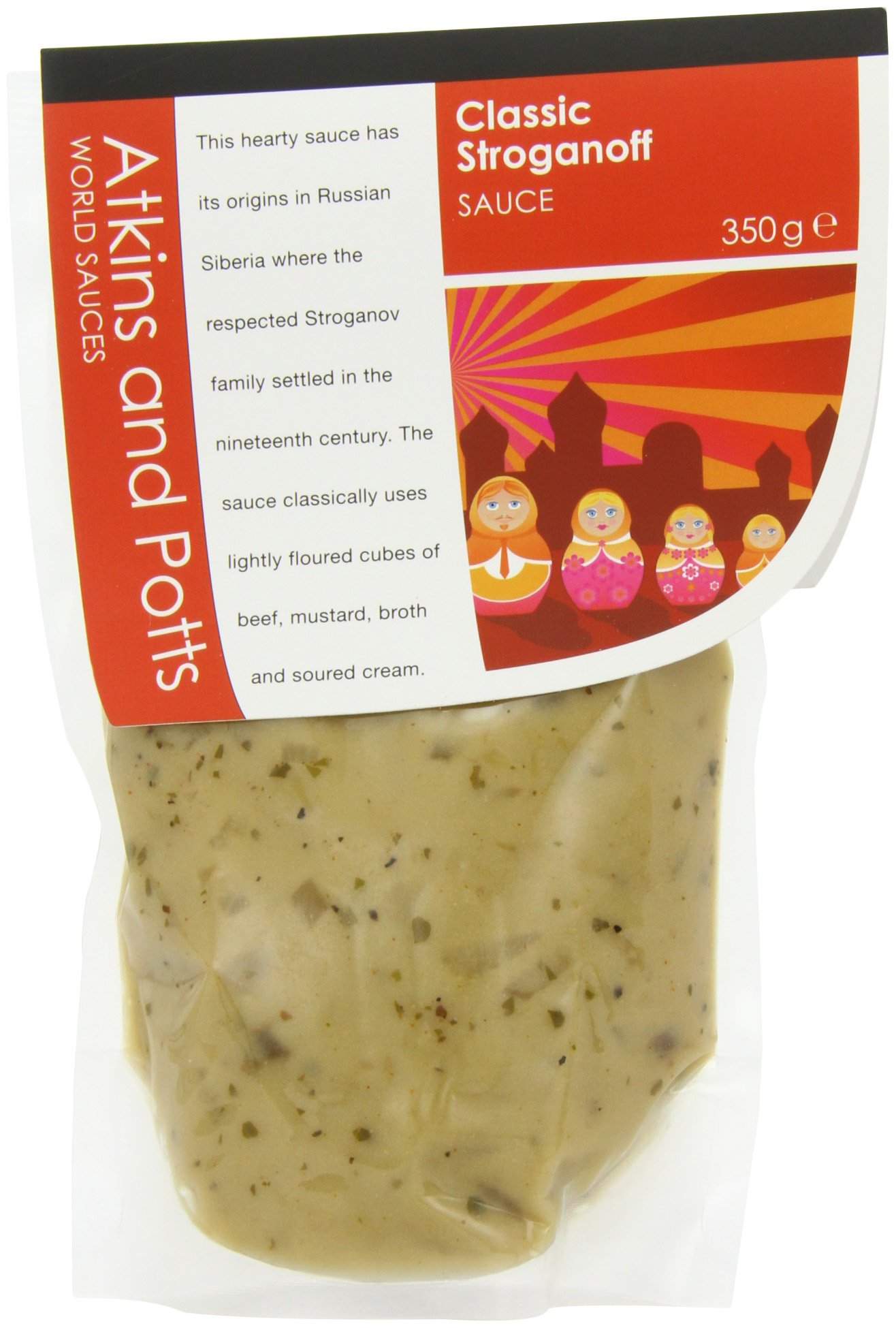 This hearty gravy originated in Russian Siberia, where the respected Stroganov family settled in the 19th century. The gravy traditionally uses lightly floured cubes of beef, mustard, stock, and sour cream. INGREDIENTS Water, mushrooms (13 ), onion, sour cream, cornflour, brandy (contains caramel coloring), rapeseed oil, sugar, concentrated lemon juice, vegetable stock powder (sea salt, hydrolyzed vegetable protein, potato starch, palm oil, vegetables [celery, onion, leek, carrot], lactose, spices, parsley), salt), emulsifier: soy protein, parsley, paprika, black pepper COOKING INSTRUCTIONS Heat and serve See moreAtkins and Potts Stroganoff Sauce 350 g (lot de 6)DESCRIPTION DU PRODUIT DESCRIPTION DU PRODUIT Cette sauce copieuse a ses origines en Sibérie russe où la famille Stroganov respectée s'est installée au XIXe siècle. La sauce utilise classiquement des cubes légèrement farinés de boeuf, de moutarde, de bouillon et de crème aigre. INGRÉDIENTS Eau, champignons (13 ), oignon, crème aigre, farine de maïs, brandy (contient du caramel colorant), huile de colza, sucre, jus de citron concentré, poudre de bouillon végétal (sel de mer, protéines végétales hydrolysées, amidon de pomme de terre, huile de palme, légumes [céleri, oignon, poireau, carotte], lactose, épices, persil), sel), émulsifiant : soja ithin, persil, Paprika, poivre noir MODE D'EMPLOI Chauffer et servir Voir plus