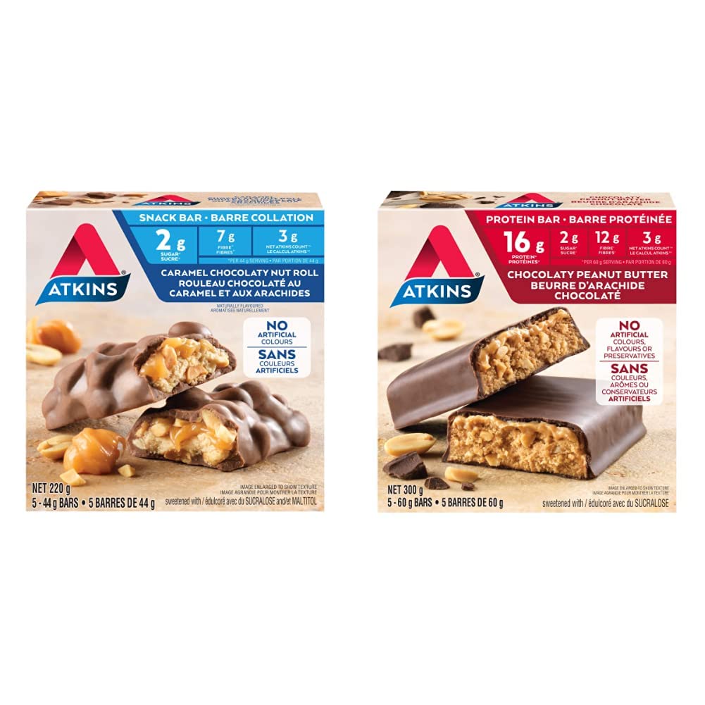 Atkins Snack Bars - Caramel Chocolaty Nut Roll, 2g Sugar, Keto-Friendly, High Fibre 5 count Atkins Caramel Chocolaty Nut Roll bars are made with a soft chewy core surrounded by real roasted peanuts and rich chewy caramel wrapped in a smooth chocolaty coating. Each bar contains fibre; and is formulated for a between meal snack. Atkins Snack Bars are keto friendly, as part of the Atkins ketogenic program. Atkins Protein Bars - chocolaty peanut butter, 2g Sugar, Keto-Friendly, High protein, high Fibre 5 count Atkins Chocolaty Peanut Butter Protein Bars are made without artificial colours and contain 0g sugar alcohols; and are made with real roasted peanuts and creamy peanut butter wrapped in a smooth chocolaty coating. Atkins Protein Bars are keto friendly, as part of the Atkins ketogenic program.
