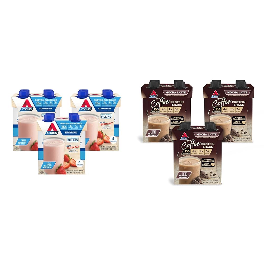Atkins Strawberry Protein Shake, 15g Protein, Low Glycemic, 2g Net Carb, 1g Sugar, Keto Friendly, 12 Count Enjoy Atkins™ Strawberry Protein Shakes. Each delicious gluten free, low glycemic strawberry flavored shake delivers 15g of protein to satisfy your hunger and keep you moving. These low sugar , low carb shakes are a great choice for when you're on the go but don't want to sacrifice great taste or settle for something with a ton of sugar or net carbs. Atkins Strawberry Protein Shakes are keto friendly , a good source of fiber , contain no artificial growth hormones, and have 2g of net carbs and 1g of sugar per serving . Atkins Mocha Latte Iced Coffee Protein Shake, 15g Protein, Low Glycemic, 4g Net Carb, 1g Sugar, Keto Friendly Atkins™ Mocha Latte flavored Iced Coffee Protein Shakes are low sugar , low carb and bring together the invigorating taste of mocha latte flavor and the enlivening kick of a cup of coffee in a delicious protein shake. There's nothing quite like a gluten free, low glycemic protein shake with the great taste of a mocha latte and the caffeine of a cup of coffee to get you going, with 15g of protein, 4g of net carbs, and 1g of sugar per serving . They're also keto friendly , a good source of fiber and contain no artificial growth hormones.Product 2: Offered in 3 cartons, each containing 4 individually bottled 16.9 fl oz shakes. Product 2: AMAZING RECIPES. Delight in the nutrients and satisfying flavors of great foods made with quality ingredients. Product 2: YOUR APPROACH. Help give your body the nutrients it needs without sacrificing your favorite flavors. Product 2: AT HOME OR ON-THE-GO. Atkins Mocha Latte Iced Coffee Protein Shakes. Enjoy delicious shakes that fit right into your busy schedule, with 15g of protein, 4g of net carbs, 1g of sugar per serving , and as much caffeine as a cup of coffee. This is Today's Atkins. Product 1: Offered in 4ct, 6ct (bonus pack) or 12ct cartons containing individually bottled 11 fl oz shakes. Product 1: AMAZING RECIPES. Delight in the nutrients and satisfying flavors of great foods made with quality ingredients. Product 1: YOUR APPROACH. Help give your body the nutrients it needs without sacrificing your favorite flavors. Product 1: AT HOME OR ON-THE-GO. Atkins Strawberry Protein Shakes. Enjoy delicious shakes that fit right into your busy schedule, with 15g of protein, 2g of net carbs, and 1g of sugar per serving . This is Today's Atkins.