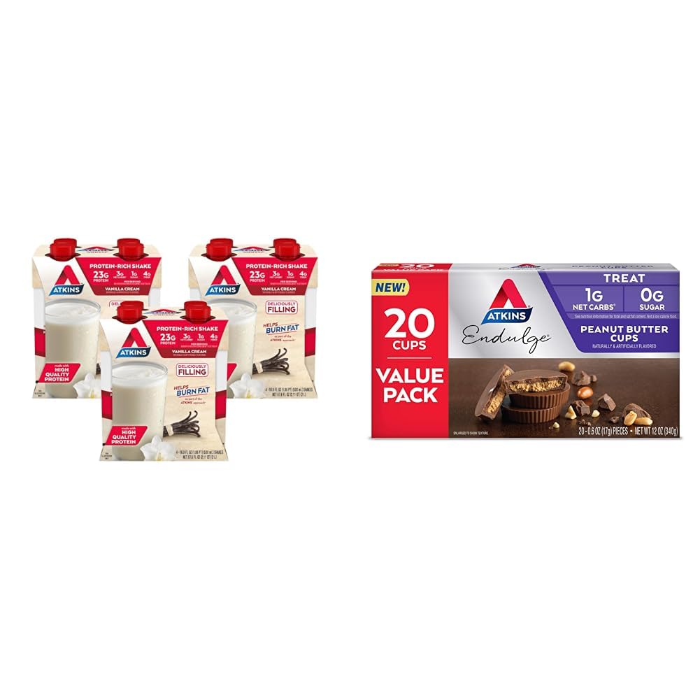 Enjoy this protein-packed bundle from Atkins that complements your low carb, low sugar lifestyle. The bundle contains 3 cartons of Atkins Meal Size Vanilla Cream Protein Shakes, with each carton containing 4 bottled 16.9 fl oz shakes. Every gluten free, keto friendly shake has 23g of protein and only 3g net carbs and 1g sugar. These delicious and convenient shakes can be enjoyed at home or on-the-go when you need a meal replacement. The bundle also includes 1 carton of 20 individually wrapped Atkins Endulge Peanut Butter Cups. Each indulgent .6oz peanut butter cup is the perfect way to satisfy your sweet tooth. With 1g net carbs and 0g sugar per cup, these treats complement your low carb lifestyle. With nearly a month's supply of protein-packed shakes and sweet treats, this bundle from Atkins helps you stay true to your nutrition goals without sacrificing flavor.