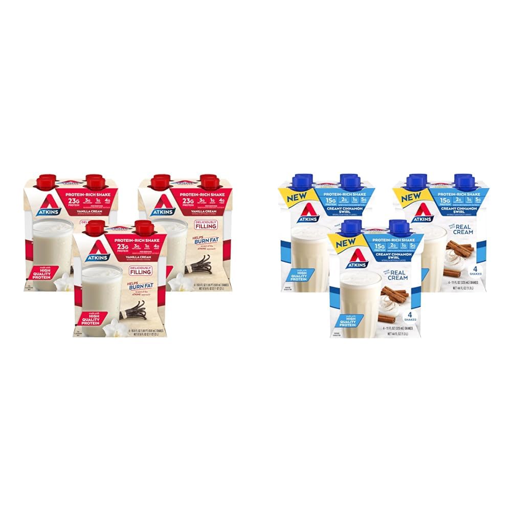 Enjoy a tasty and nutritious shake bundle from Atkins with the Atkins Meal Size Vanilla Cream Protein Shakes and Atkins Creamy Cinnamon Swirl Protein Shakes. The Vanilla Cream shakes contain 23g of protein, 3g of net carbs, and 1g of sugar per 16.9 oz serving to help satisfy hunger and support an active, low-carb lifestyle. Made with real cream, the Cinnamon Swirl shakes offer 15g of protein, 2g of net carbs, and 1g of sugar per 11 oz serving. Both gluten-free shakes are keto-friendly with low glycemic impact. The Vanilla Cream has a delicious vanilla cream flavor while the Cinnamon Swirl offers a sweet cinnamon swirl flavor with real cream. They make great on-the-go meal replacements or snacks that don't sacrifice taste or nutrition. With high protein and fiber plus low sugar and carbs, these complementary shakes support your health goals. Enjoy the Vanilla Cream shake for a higher protein option or the Cinnamon Swirl for a slightly lighter, sweetly spiced shake. With amazing recipes focused on quality ingredients and nutrients, Atkins shakes help delight your taste buds while staying true to a low-carb lifestyle.