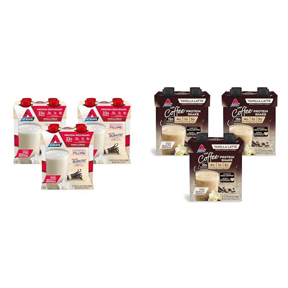 Atkins Vanilla Cream Meal Size Protein Shake 23g Protein Low Glycemic 3g Carb 1g Sugar Keto Friendly & Iced Coffee Vanilla Latte Protein Shake 15g Protein Low Glycemic 4g Net Carb