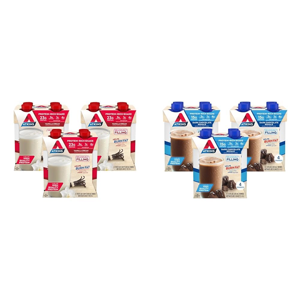 Atkins Vanilla Cream Meal Size Protein Shake, 23g Protein, Low Glycemic, 3g Carb, 1g Sugar, Keto Friendly Enjoy Atkins™ Meal Size Vanilla Cream Protein Shakes. Each delicious gluten free, low glycemic vanilla flavored shake has 23g of protein to satisfy your hunger and keep you moving. Low sugar , low carb meal size vanilla cream flavored shakes are a great choice at meal time or when you're on the go but don't want to sacrifice great taste or settle for something with a ton of sugar or net carbs. These Atkins shakes are keto friendly , a good source of fiber , contain no artificial growth hormones, and have 3g of net carbs and 1g of sugar per serving . Atkins Dark Chocolate Royale Protein Shake, 15g Protein, Low Glycemic, 2g Net Carb, 1g Sugar, Keto Friendly, 12 Count Enjoy Atkins™ Dark Chocolate Royale Protein Shakes. Each delicious dark chocolate flavored shake delivers 15g of protein to satisfy your hunger and keep you moving. These low sugar , low carb shakes are a great choice for when you're on the go but don't want to sacrifice great taste or settle for something with a ton of sugar or net carbs. Atkins Dark Chocolate Royale Protein Shakes are keto friendly , a good source of fiber , contain no artificial growth hormones, and have 2g of net carbs and 1g of sugar per serving .Product 2: Offered in 3 cartons, each containing 4 individually bottled 11 fl oz shakes. Product 2: AMAZING RECIPES. Delight in the nutrients and satisfying flavors of great foods made with quality ingredients. Product 2: YOUR APPROACH. Help give your body the nutrients it needs without sacrificing your favorite flavors. Product 2: AT HOME OR ON-THE-GO. Atkins Dark Chocolate Royale Protein Shakes. Enjoy delicious shakes that fit right into your busy schedule, with 15g of protein, 2g of net carbs, and 1g of sugar per serving . This is Today's Atkins. Product 1: Offered in 3 cartons, each containing 4 individually bottled 16.9 fl oz shakes. Product 1: AMAZING RECIPES. Delight in the nutrients and satisfying flavors of great foods made with quality ingredients. Product 1: YOUR APPROACH. Help give your body the nutrients it needs without sacrificing your favorite flavors. Product 1: AT HOME OR ON-THE-GO. Atkins Meal Size Vanilla Cream Protein Shakes. Enjoy delicious shakes that fit right into your busy schedule, with 23g of protein, 3g of net carbs, and 1g of sugar per serving . This is Today's Atkins.