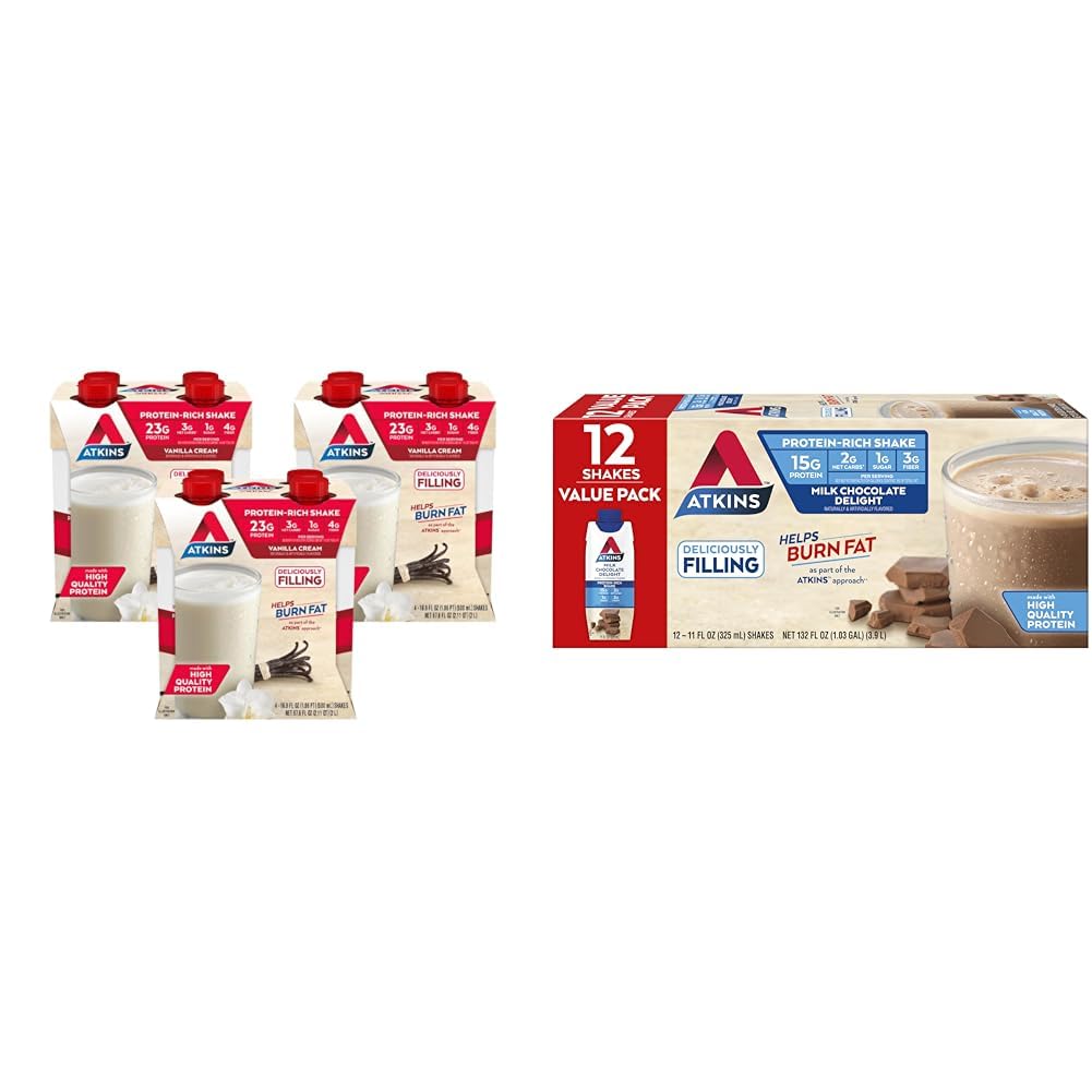 Atkins Vanilla Cream Meal Size Protein Shake, 23g Protein, Low Glycemic, 3g Carb, 1g Sugar, Keto Friendly Enjoy Atkins™ Meal Size Vanilla Cream Protein Shakes. Each delicious gluten free, low glycemic vanilla flavored shake has 23g of protein to satisfy your hunger and keep you moving. Low sugar , low carb meal size vanilla cream flavored shakes are a great choice at meal time or when you're on the go but don't want to sacrifice great taste or settle for something with a ton of sugar or net carbs. These Atkins shakes are keto friendly , a good source of fiber , contain no artificial growth hormones, and have 3g of net carbs and 1g of sugar per serving . Atkins Milk Chocolate Delight Protein Shake, 15g Protein, Low Glycemic, 2g Net Carb, 1g Sugar, Keto Friendly, 12 Count Enjoy Atkins™ Milk Chocolate Delight Protein Shakes. Each delicious gluten free and low glycemic milk chocolate flavored shake delivers 15g of protein to satisfy your hunger and keep you moving. These low sugar , low carb shakes are a great choice for when you're on the go but don't want to sacrifice great taste or settle for something with a ton of sugar or net carbs. Atkins Milk Chocolate Delight Protein Shakes are keto friendly , a good source of fiber , contain no artificial growth hormones, and have 2g of net carbs and 1g of sugar per serving .Product 2: Offered in 12ct cartons containing individually bottled 11 fl oz shakes. Product 2: AMAZING RECIPES. Delight in the nutrients and satisfying flavors of great foods made with quality ingredients. Product 2: YOUR APPROACH. Help give your body the nutrients it needs without sacrificing your favorite flavors. Product 2: AT HOME OR ON-THE-GO. Atkins Milk Chocolate Delight Protein Shakes. Enjoy delicious shakes that fit right into your busy schedule, with 15g of protein, 2g of net carbs and 1g of sugar per serving . This is Today's Atkins. Product 1: Offered in 3 cartons, each containing 4 individually bottled 16.9 fl oz shakes. Product 1: AMAZING RECIPES. Delight in the nutrients and satisfying flavors of great foods made with quality ingredients. Product 1: YOUR APPROACH. Help give your body the nutrients it needs without sacrificing your favorite flavors. Product 1: AT HOME OR ON-THE-GO. Atkins Meal Size Vanilla Cream Protein Shakes. Enjoy delicious shakes that fit right into your busy schedule, with 23g of protein, 3g of net carbs, and 1g of sugar per serving . This is Today's Atkins.
