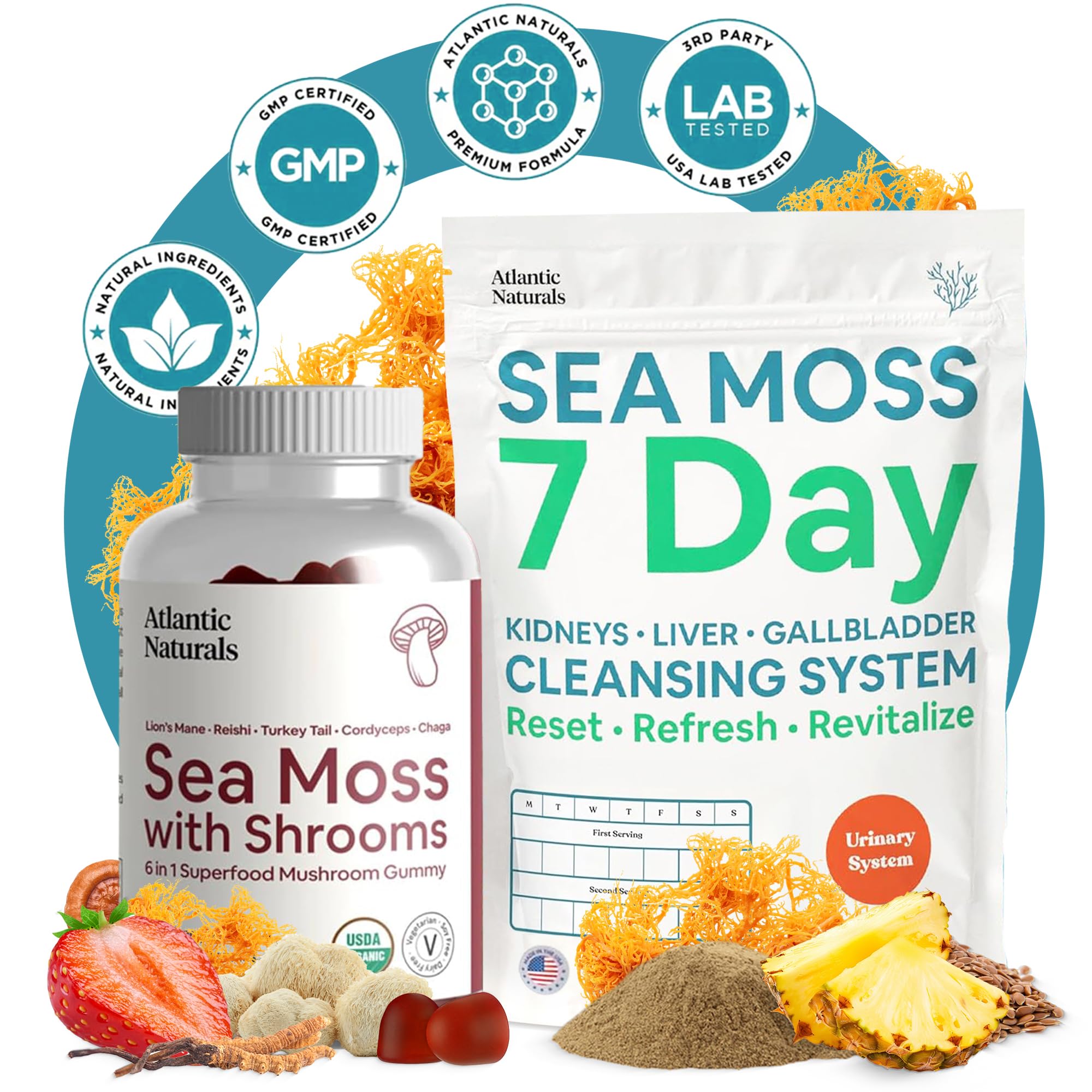 Atlantic Naturals Sea Moss Superfood Bundle - Sea Moss with Shrooms Gummies & 7-Day Kidney Liver & Gallbladder Cleanse - Defense Focus & Detox Support - Lion's Mane Reishi Dandelion Root & More