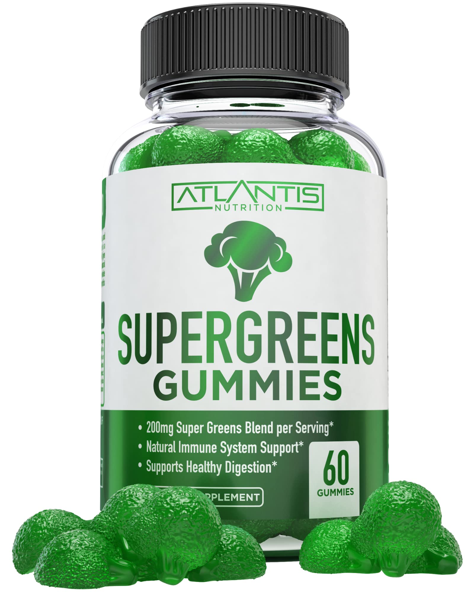 Atlantis Nutrition Supergreens Gummies - Daily Green Superfoods Supplement with Spinach Broccoli Moringa Beet Root Celery Green Tea & Acai for Immunity Support - Natural Raspberry Flavor 60 cnt 60 Count (Pack of 1)