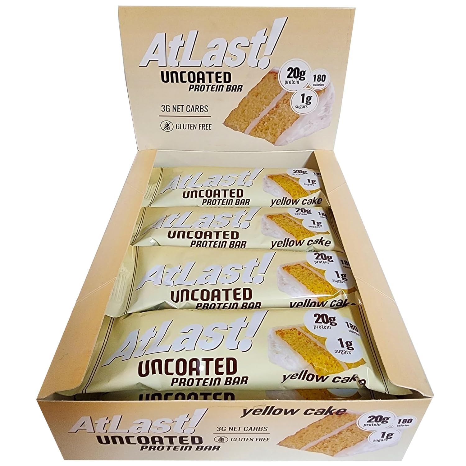 20g of Protein per Bar. One box of 12 bars. FIBER TO FILL YOU: Each AtLast! Yellow Cake Protein Bar contains 12g of fiber, helping increase satiety and give your body a more balanced and complete macro profile. CRAVE-WORTHY COMFORT ANYTIME: AtLast! Yellow Cake Protein Bars are a deliciously sweet indulgence with no added sugar, perfect for satisfying your sweet tooth whenever the craving hits. SAVOR FULL-PROTEIN POWER: AtLast! Yellow Cake Protein Bars are crafted with complete, dairy-based proteins, delivering all 9 essential amino acids your body needs with low lactose levels.