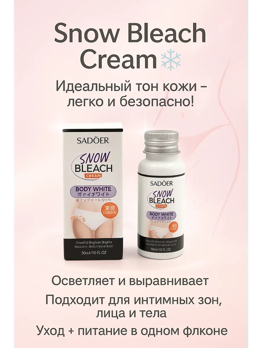 Ключевые слова: отбеливающий крем, крем для интимных зон, осветляющее средство для тела, отбеливающий крем для подмышек, крем против пигментации, крем для выравнивания тона кожи, snow bleach cream, intimate whitening cream, body whitening cream, skin brightening lotion