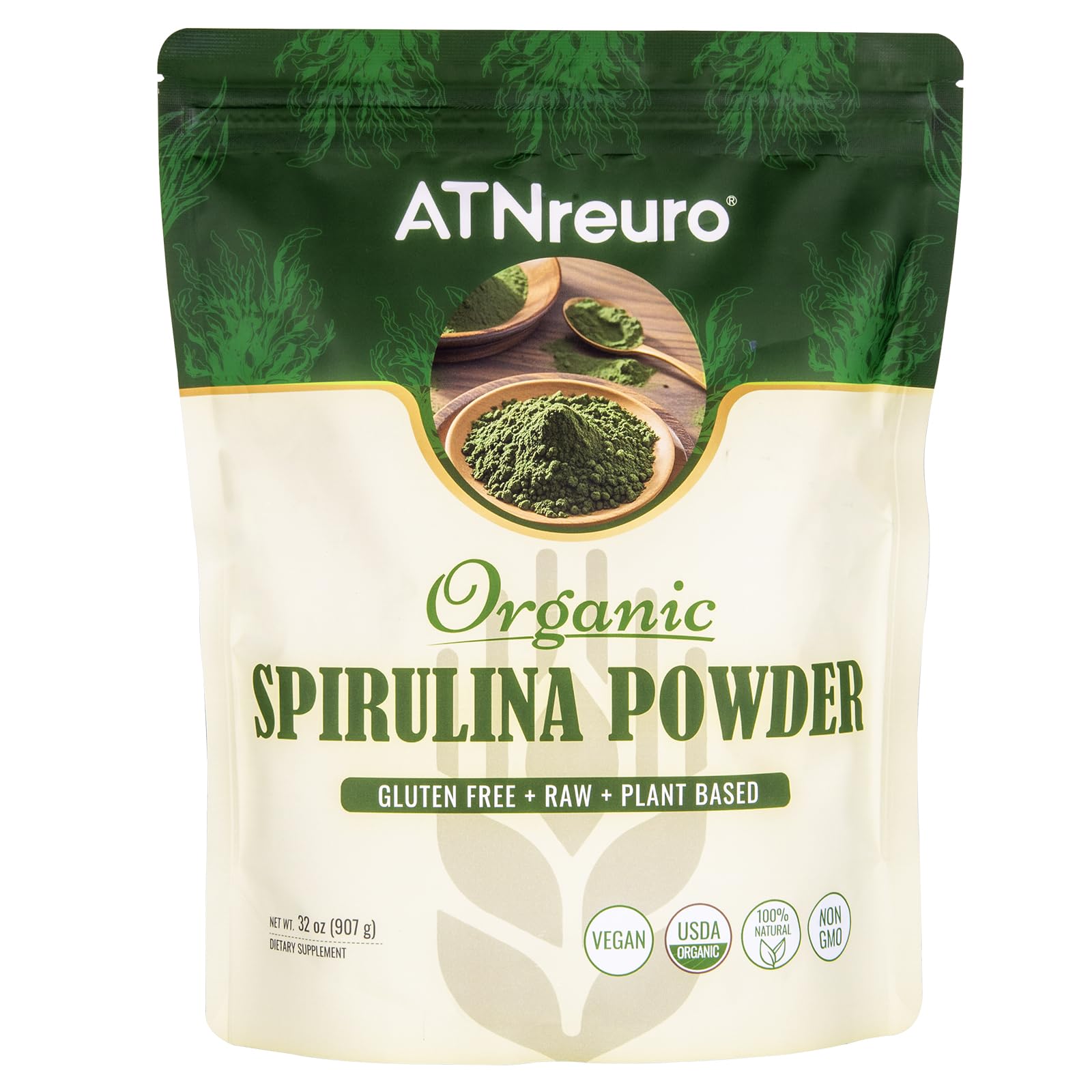 ATNreuro Organic Spirulina Powder 32oz USDA Certified 100% Pure & Natural Non-GMO Gluten-Free Detox & Energy Boost Rich in Protein Iron Antioxidants Superfood for Smoothies Ideal for Vegan