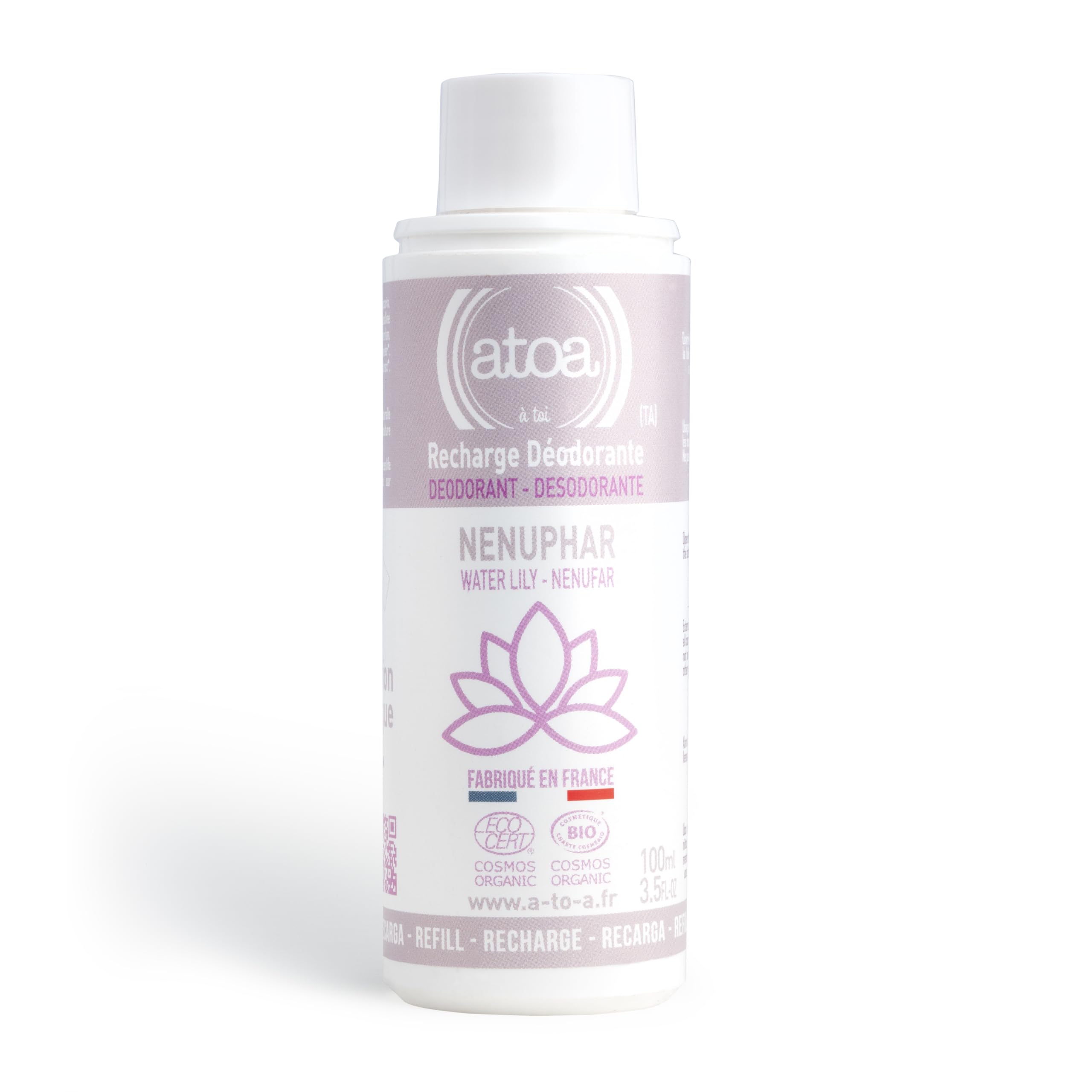 Discover the Atoa deodorant refill with Water Lily extract. One 100ml refill provides two refills of your Cosmos Organic foll-on. Made in France. SAFETY WARNING For external use only. Keep out of reach of children. Avoid contact with eyes and mucous membranes. Do not swallow.