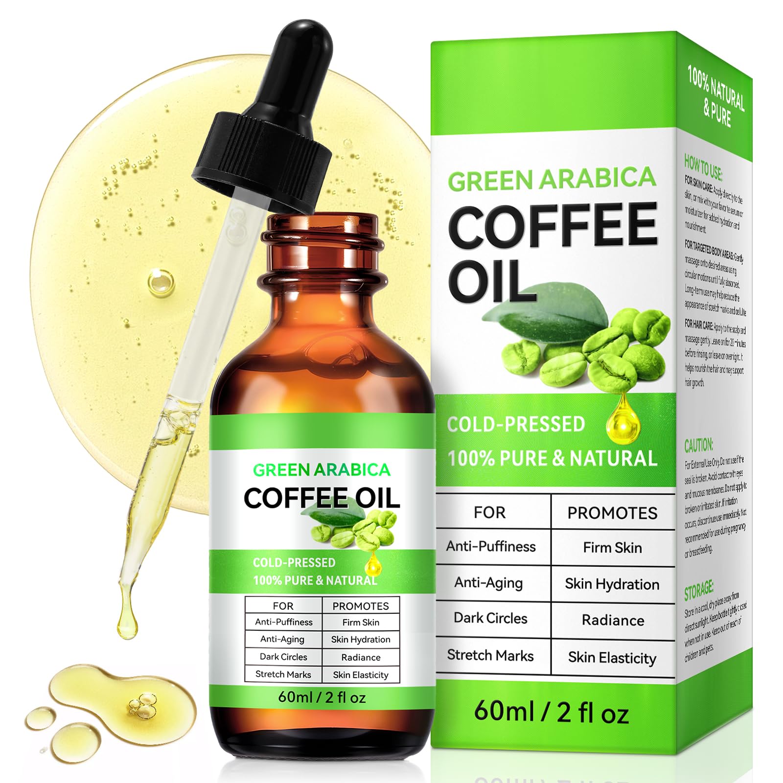 Coffee Oil Against Wrinkles, Face, Body, Hair, Green Arabica Coffee Oil for Anti-Swelling, Anti-Aging, Dark Circles Under Eyes, Stretch Marks, Promotes Tightening Skin, Skin Moisture, Radiation, Skin Elasticity, 100 Pure and Natural, Cold Pressed, Vegan Premium Therapy Quality, 60 ml E 2.02 fl.oz SAFETY WARNING For external use only. Do not use if seal breaks. Avoid contact with eyes and mucous membranes. Do not apply to broken or irritated skin. If irritation occurs, use immediately. Not recommended for use during pregnancy or lactation.Revitalizing the skin: the natural caffeine in green coffee oil promotes blood circulation, helps reduce swelling and provides a radiant complexion. Deeply effective care - the coffee oil is rich in natural fatty acids, deeply and effectively nourishes the skin, strengthens the moisture barrier and prevents water loss, so that the skin remains soft and smooth after use. Coffee oil against wrinkles, versatile applications - face: effectively reduces swelling, dark circles and fine lines. Body: Helps fade stretch marks and cellulite while improving skin smoothness. Hair: Conditions the scalp and promotes healthy hair growth. One bottle meets all your beauty needs and saves you time and effort. Pioneer among antioxidants: coffee oil face rich in chlorogenic acid, helps fight free radical damage and slows down the signs of skin aging. Long-term use improves the elasticity, firmness and radiance of the skin. Pure and natural, quality assured – coffee oil is 100 pure, natural oil from green coffee beans, free of additives. The cold-pressed extraction process fully preserves the natural active ingredients, so that no nutrients are lost.Koffieolie tegen rimpels - 100 puur en natuurlijk groene Arabica-koffieolie voor gezicht, lichaam, haar, anti-puffiness en stevige huid, koffieolie, huidverzorging, koudgeperst en veganistisch, 60 ml Koffieolie tegen rimpels, gezicht, lichaam, haar, groene Arabica-koffieolie voor anti-zwellingen, anti-aging, donkere kringen onder de ogen, striae, bevordert een strakkere huid, huidvochtigheid, straling, huidelasticiteit, 100 zuiver en natuurlijk, koudgeperst, veganistische premium therapiekwaliteit, 60 ml E 2,02 fl.oz VEILIGHEIDSWAARSCHUWING Alleen voor uitwendig gebruik. Niet gebruiken als de verzegeling breekt. Vermijd contact met ogen en muceuze membranen. Niet aanbrengen op gebroken of geïrriteerde huid. Als irritatie optreedt, gebruik dan onmiddellijk gebruiken. Niet aanbevolen voor gebruik tijdens zwangerschap of borstvoeding.Revitalisering van de huid: de natuurlijke cafeïne in de groene koffieolie bevordert de doorbloeding, helpt zwellingen te verminderen en zorgt voor een stralende teint. Diepteeffectieve verzorging – de koffieolie is rijk aan natuurlijke vetzuren, verzorgt de huid diep en effectief, versterkt de vochtbarrière en voorkomt waterverlies, zodat de huid na gebruik zacht en glad blijft. Koffieolie tegen rimpels, veelzijdige toepassingsmogelijkheden – gezicht: vermindert effectief zwellingen, donkere kringen en fijne lijntjes. Lichaam: helpt striae en cellulitis te vervagen en verbetert tegelijkertijd de gladheid van de huid. Haar: Verzorgt de hoofdhuid en bevordert een gezonde haargroei. Een fles voldoet aan al je schoonheidsbehoeften en bespaart je tijd en moeite. Pionier onder de antioxidanten: koffieolie gezicht rijk aan chlorogeenzuur, helpt schade door vrije radicalen te bestrijden en vertraagt de tekenen van huidveroudering. Langdurig gebruik verbetert de elasticiteit, stevigheid en uitstraling van de huid. Zuiver en natuurlijk, kwaliteitsverzekerd – koffieolie is 100 zuivere, natuurlijke olie van groene koffiebonen, vrij van additieven. Door het koudgeperste extractieproces blijven de natuurlijke werkzame stoffen volledig behouden, zodat er geen voedingsstoffen verloren gaan.