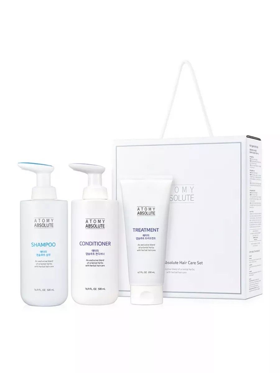 Система по уходу за волосами Atomy Absolute Hair Care Set Воплоти в жизнь мечту о красивых волосах! С набором люксовой косметики для ухода за волосами Absolute ты поймешь, как просто это сделать. Шампунь 500 мл. Кондиционер 500 мл. Лечебная маска для волос 200 мл. Линия Абсолют - это сочетание силы природы и самых современных технологий для создания роскошных волос. Высокое содержание натуральных компонентов и использование секретов корейской народной медицины сделают твои волосы живыми и блестящими от корней и до кончиков. Целебные свойства трав помогают бережно ухаживать за кожей головы и дают волосам живительную силу. Аромат трав легкий, приятный и совершенно ненавязчивый. После применения волосы легкие, гладкие , воздушные и прекрасно укладываются. А использование маски их абсолютно не утяжеляет. . Атоми Абсолют это: Избранные рецепты ВОСТОЧНОЙ МЕДИЦИНЫ Эффективная борьба с ВЫПАДЕНИЕМ ВОЛОС Мягкий БЕЗОПАСНЫЙ СОСТАВ. Шампунь не содержит силикона и оснащен удобным дозатором
