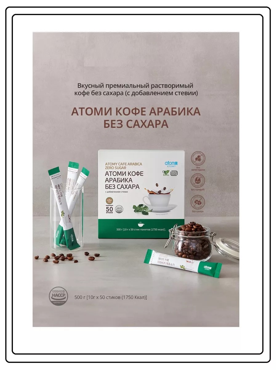 Атоми Кофе Арабика без сахара с добавлением стевии 50 шт (Atomy Cafe Arabica Zero Sugar)