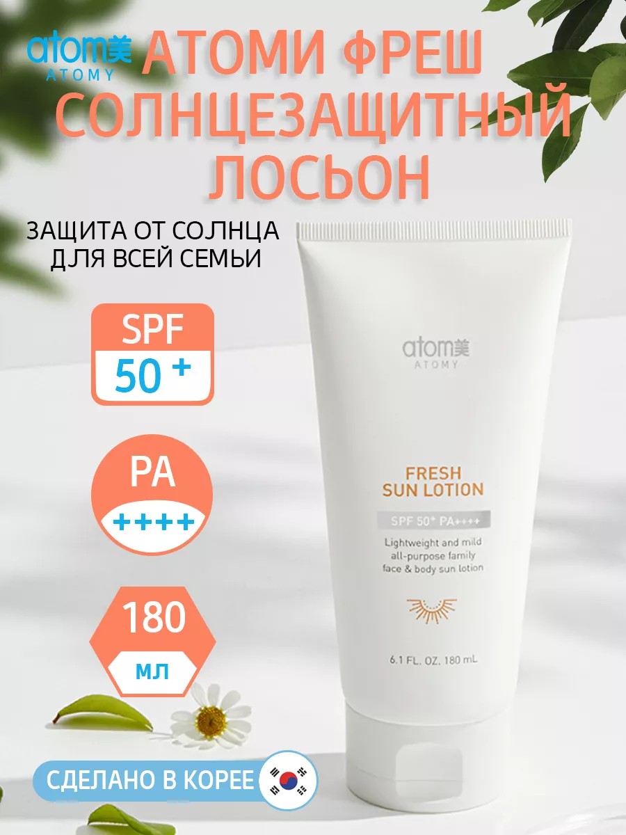 Откройте для себя НОВИНКУ Atomy Фреш Солнцезащитный Лосьон SPF 50+ PA++++, идеальное решение для защиты кожи всей семьи от вредного воздействия ультрафиолетовых лучей. Этот продукт станет незаменимым помощником в уходе за кожей, предлагая не только высокий уровень защиты от солнца, но и увлажнение с успокаивающим эффектом.