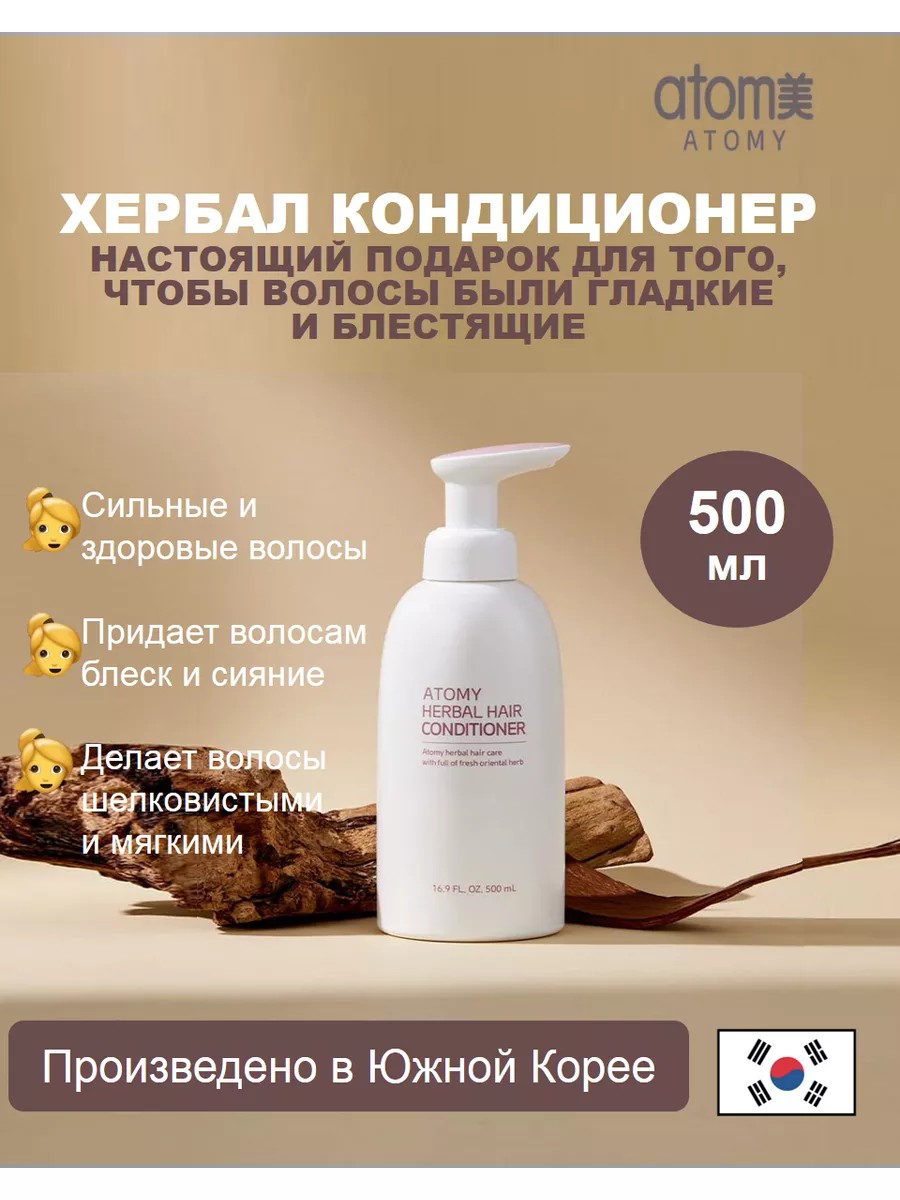 Atomy Herbal Conditioner — кондиционер от корейского производителя, созданный для поддержания здорового внешнего вида ваших волосах. Он пригодится, чтобы закрыть кутикулярный слой после мытья шампунем и сберечь ваши волосы от сухости и повреждений. Atomy Herbal Conditioner: Имеет мягкий состав на водной основе, а его pH равен здоровому кислотному балансу волос в 6,0 – 7,0 единиц В состав входят комплексы Сэнмодан и HGSC — экстракты 26 трав для заботы о здоровье волос. Они наполняют волосы питательными веществами, укрепляют и восстанавливают их природный блеск Предотвращает электризацию волос — прическа не будет пушиться Подходит для здоровых и поврежденных волос. Эффект заметен после первого использования. Волосы перестают путаться и приобретают опрятный внешний вид. Если вы пользовались агрессивными средствами укладки или обесцвечивали прическу — кондиционер восстановит здоровую структуру волос. Рекомендации для применения: Используйте после мытья головы шампунем Распределяйте кондиционер равномерно по длине волос. Корни старайтесь избегать, иначе прическа потеряет объемность Поддержите кондиционер 5 минут Смойте слегка прохладной водой — так вы лучше закроете кутикулярный слой волоса. Используйте кондиционер от Атоми регулярно, чтобы закрепить его эффект Atomy Herbal Conditioner поставляется в удобном флаконе с дозатором объемом 500 мл.
