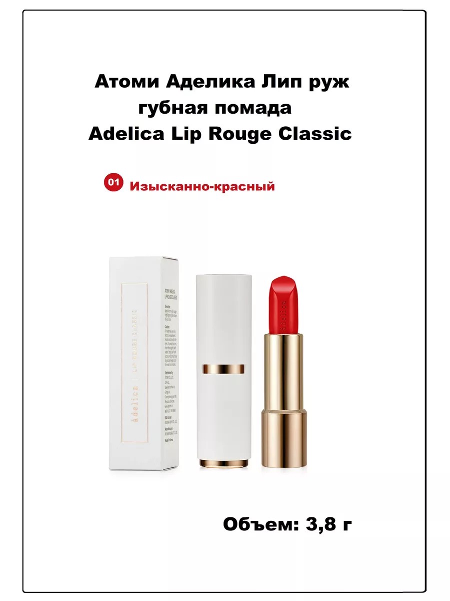 Аделика Лип руж губная помада Атоми (Adelica Lip Rouge Classic 01- изысканно-красный) - губная помада Атоми с насыщенным и длительным пигментированным оттенком. Обеспечивает глубокий и насыщенный цвет и предотвращает высушивание губ. Формула помады богата маслами и антиоксидантами, которые питают и увлажняют губы. Помада легко наносится и долго держится.