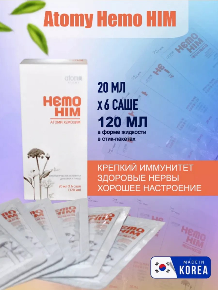 "Аtomy HemoHim – это источник силы и жизненной энергии организма. Не является лекарственным препаратом. Объем 6 пакетиков по 20 мл. Атоми ХемоХИМ — созданный на основе натуральных экстрактов трав, способствующих стимуляции и поддержанию иммунитет. ХемоХИМ укрепляет и регулирует иммунную систему, стимулирует формирование организмом новых клеток крови и гемоглобина. Растительная композиция ХемоХим улучшает противораковую активность, иммунную функцию и функцию кроветворения организма и ингибирует окислительное повреждение организма. Может применяться для предотвращения побочных эффектов терапии рака путем стимуляции восстановления поврежденной иммунной функции и функции кроветворения, а также ингибирования окислительного повреждения. Кроме того, благодаря своим полезным свойствам, растительная композиция HemoHIM может применяться для профилактики различных дегенеративных хронических заболеваний и улучшения здоровья ослабленных и пожилых людей. Подарок для здоровья. Принимать HemoHIM необходимо по 1 пакетику (20 мл) 2 раза в день во время еды.Базовый профилактический курс рассчитан на 30 дней. Второй прием рекомендуется не менее чем за 4 часа до сна. Для производства ХемоХим Atomy использует экзотичные растения, выращенные в Корее и используемые в восточной медицине с давних времен: дудник гигантский, жгун-корень и пион японский. Основные ингредиенты экстрагируются из этих уникальных растений и добавляются в состав Hemo Him. Корейские витамины. ЗАПРЕШАЕТСЯ детям младше 6 лет. Перед применением проконсультироваться с врачом.