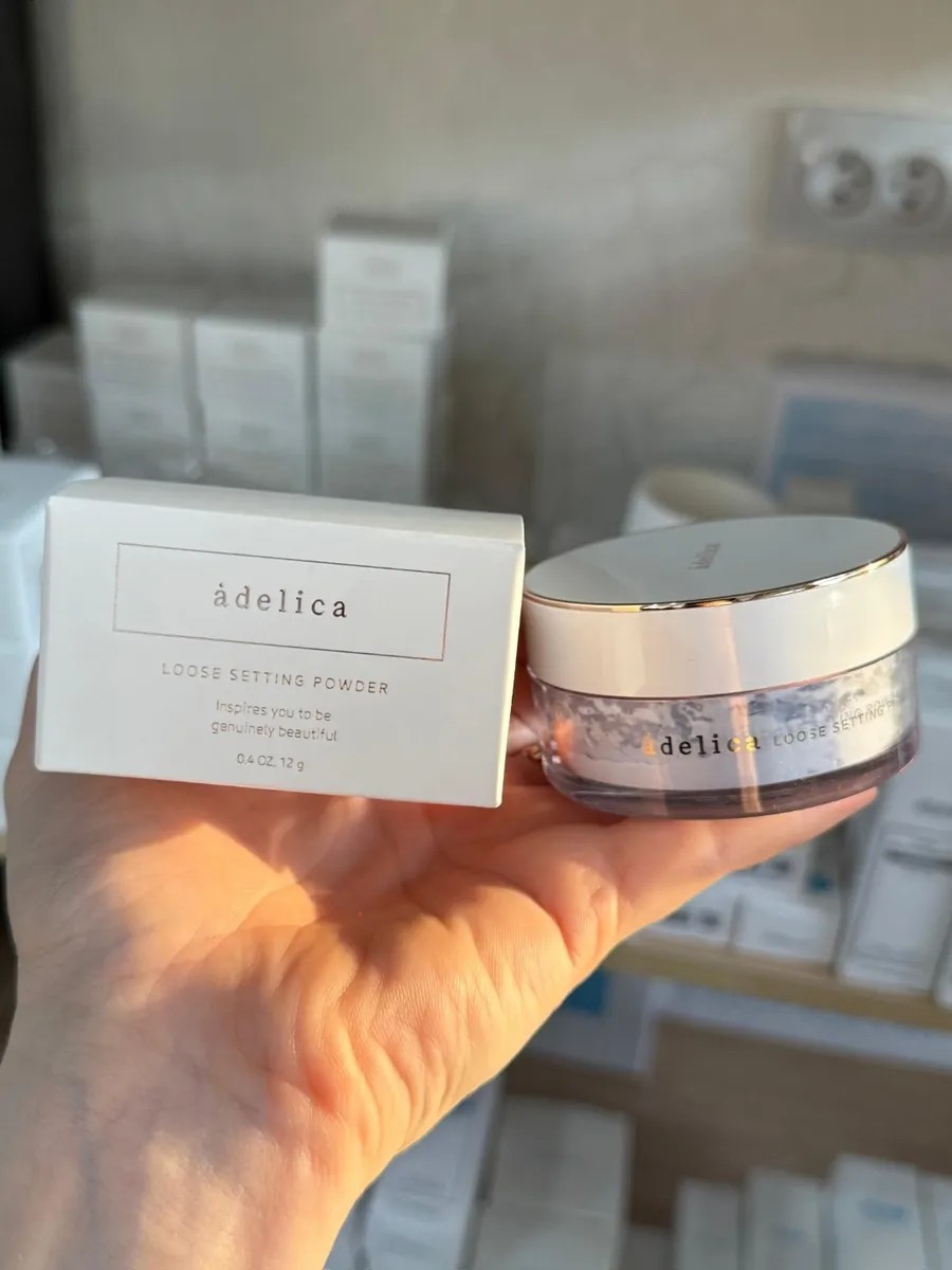A loose face powder from the Korean brand Atomy, ADELICA LOOSE SETTING POWDER, is a superfine two-tone powder.