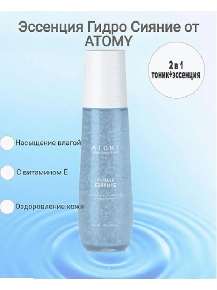 Корейская компания Atomy производит только высококачественную, экологически чистую и безопасную для здоровья и тела продукцию, в отличии от большинства других всемирно известных и популярных брендов!Atomy Гидра Сияние Эссенция Атоми 130 мл.Атоми гидра сияния капсульная эссенция - насыщение кожи влагой. Эссенция помогает образованию здорового блеска на лице благодаря микро капсулам в составе. Тоник и эссенция в одной флаконе. Легкий по текстуре как тоник и питательный как эссенция. Можно использовать сразу после умывания. Микрокапсулированный витамин Е и другие полезные компоненты глубоко проникают в кожу и дарят ощущения увлажненности кожи. Микрокапсулы способствуют глубокому увлажнению кожи, а также сохранению влаги надолго. Комплектация: 1 флакон - 130 мл.