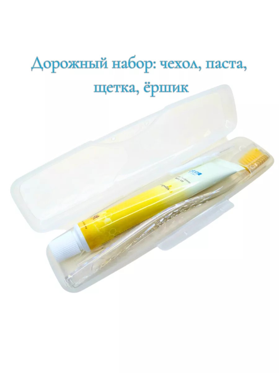 Зубная паста: Натуральная. На основе прополиса. Удаление зубного налета. Предотвращение образования зубных полостей. Предотвращение отложения зубного камня. Удаление неприятного запаха.Лечение воспалений и ранок в полости рта.Идеально для полоскания горла и снятия воспалений при простуде, а так же лечения ранок и укусов насекомых. Апельсиновое масло и цитрусовый аромат добавляют свежести. Щетка: Удобная ручка, облегчающая процесс чистики зубов. Экологически безопасна, не содержит химических веществ. Скругленная и тонкая головка щетки помогает достичь дальних зубов. Антибактериальная щетина, мембраны которой эффективны даже когда щетина не используется, поддерживая её в чистоте. Тонкие волоски щетины эффективно удаляют остатки пищи и налет, дарит освежающее чувство для ваших зубов и десен. Ершик для чистки межзубного пространства. Маленький, удобный, закрыт специальным колпачком. Удобный закрывающийся контейнер с вентилируемым донышком.