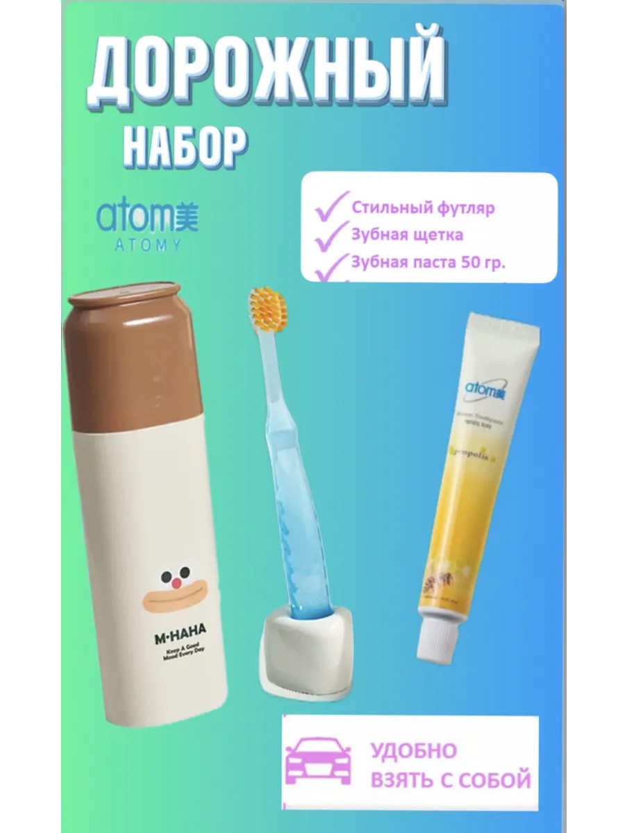 Дорожный набор зубная паста + зубная щетка. детский набор от Atomy — это идеальный компаньон для маленьких путешественников. Набор включает в себя детскую зубную пасту с приятным вкусом , мягкую зубную щетку и футляр Конструкция контейнера плотная, не скользит в руке. Плотно прилегающая крышка, которую можно открыть легким движением, Компактный размер набора позволяет удобно взять его с собой в дорогу, в гости или на прогулку. С Atomy ваш ребенок всегда будет иметь чистую и здоровую улыбку, где бы он ни находился. Компактный и удобный набор включает в себя все необходимое для чистки зубов: фторсодержащую зубную пасту Atomy, эффективно очищающую зубы от налета и защищающую от кариеса, и мягкую зубную щетку с удобной ручкой. Благодаря своему небольшому размеру, набор легко помещается в дорожную сумку или косметичку, не занимая много места. Он станет незаменимым помощником для поддержания здоровья и свежести улыбки в любой ситуации.Зубная паста совмещает ежедневный уход и профилактику, с мягким отбеливанием на 1-2 тона в месяц и надежную защиту от кариеса. Активные элементы в составе пасты обеспечивают защиту зубов и десен, предотвращают отложение зубного камня, быстро и эффективно уничтожают налет и бактерии, которые являются источником неприятного запаха. Основными ингредиентами в составе пасты являются: экстракт ПРОПОЛИСА (природный антисептик, антибиотик с антибактериальным и противовоспалительным эффектом для предотвращения распространения различных бактерий и вирусов) и экстракт ЗЕЛЕНОГО ЧАЯ (катехины в его составе, усиливают иммунитет, обладают эффектом антиоксидантов и антибиотиков, благодаря дезодорирующему действию эффективно удаляет неприятный запах) Подарочный набор в пластиковом контейнере станет отличным сюрпризом на любой праздник новый год, 23 февраля, 8 марта, день рождения, день всех влюбленных или будучи преподнесённым просто так. Подарите его своей любимой,сыну, дочке,, другу, подруге